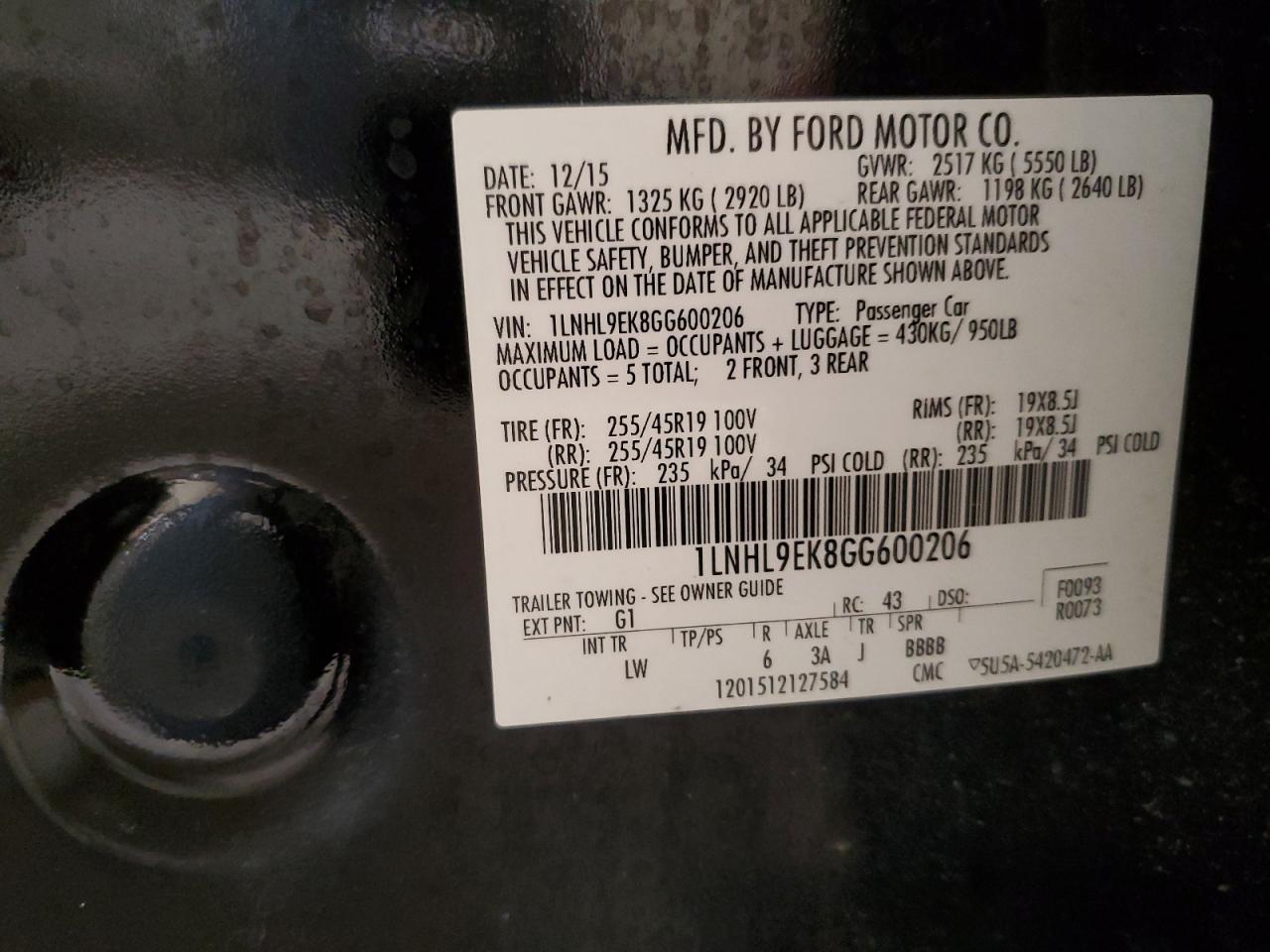 LINCOLN MKS 3.7 2016 г.в., Полный привод (1LNHL9EK8GG600206) из США
