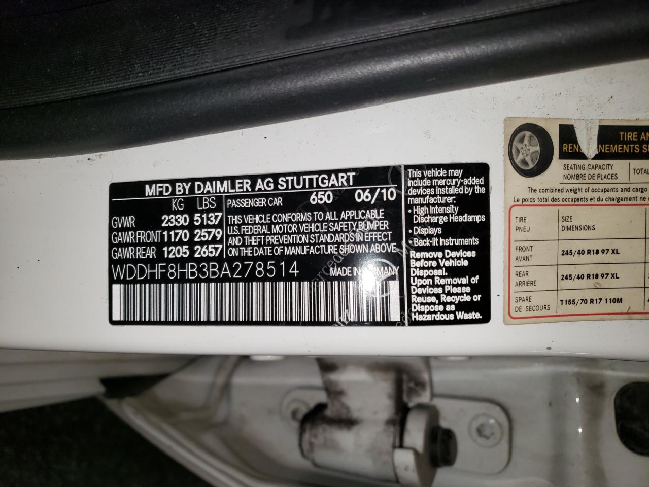 Цвет БелыйЦилиндры 6Привод Полный приводVIN WDDHF8HB3BA278514Состояние Заводится и едет (проверено)Повреждение НезначительныеДата аукциона 2025-11-04