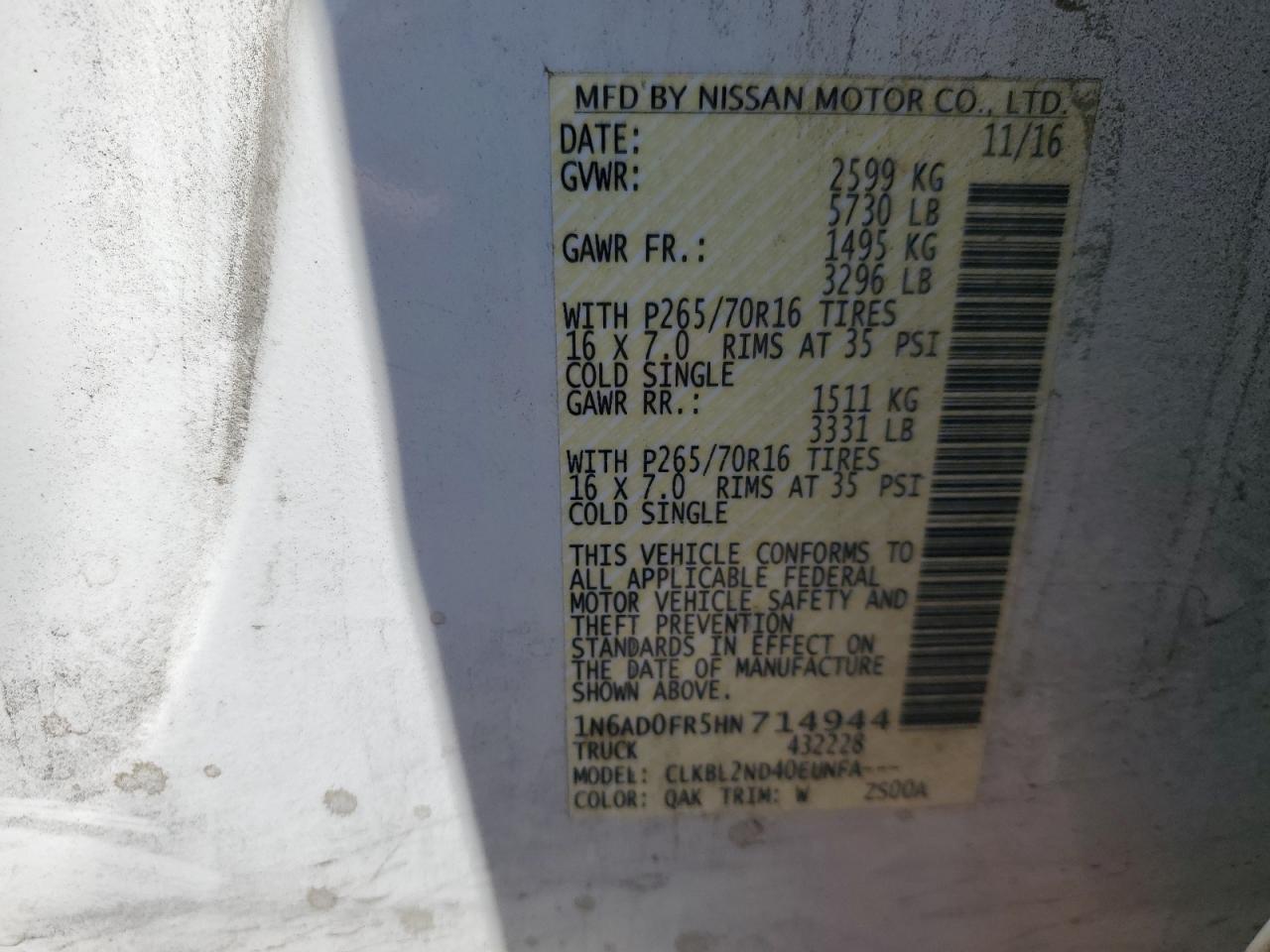 NISSAN 210 4.0 2017 г.в., Задний привод (1N6AD0FR5HN714944) из США