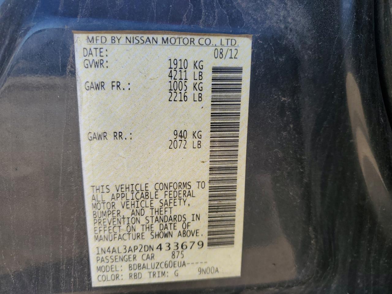 NISSAN ALTIMA 2.5 2013 г.в., (1N4AL3AP2DN433679) из США