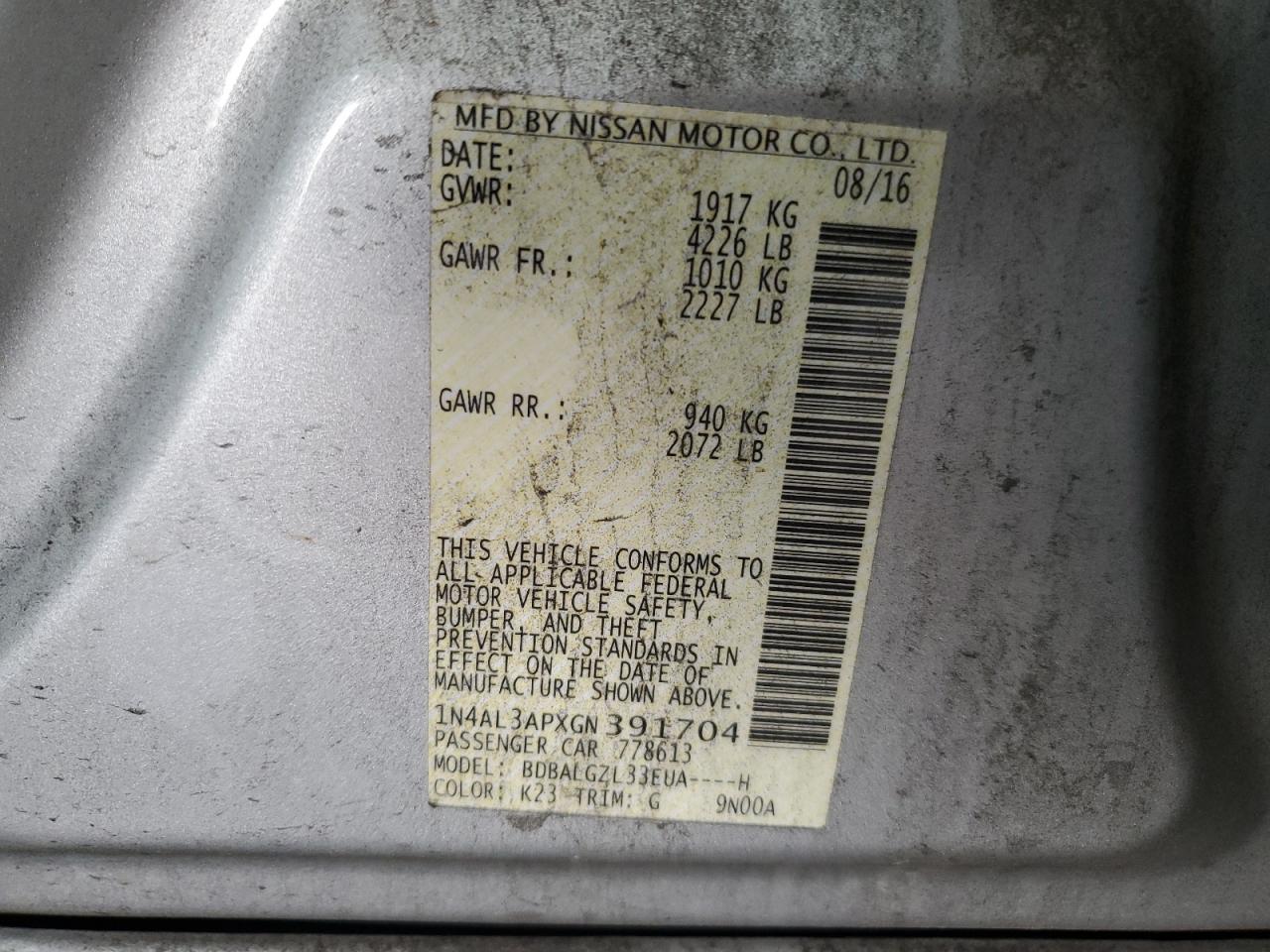 Цвет СеребряныйЦилиндры 4VIN 1N4AL3APXGN391704Состояние НеизвестноПовреждение Передняя или задняя