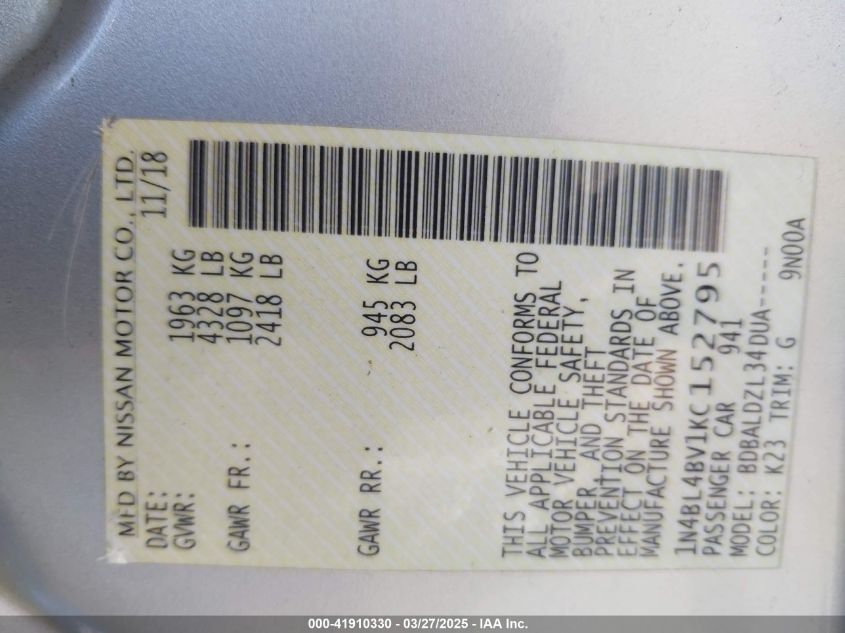 NISSAN ALTIMA 2.5 2019 г.в., Передний привод (1N4BL4BV1KC152795) из США
