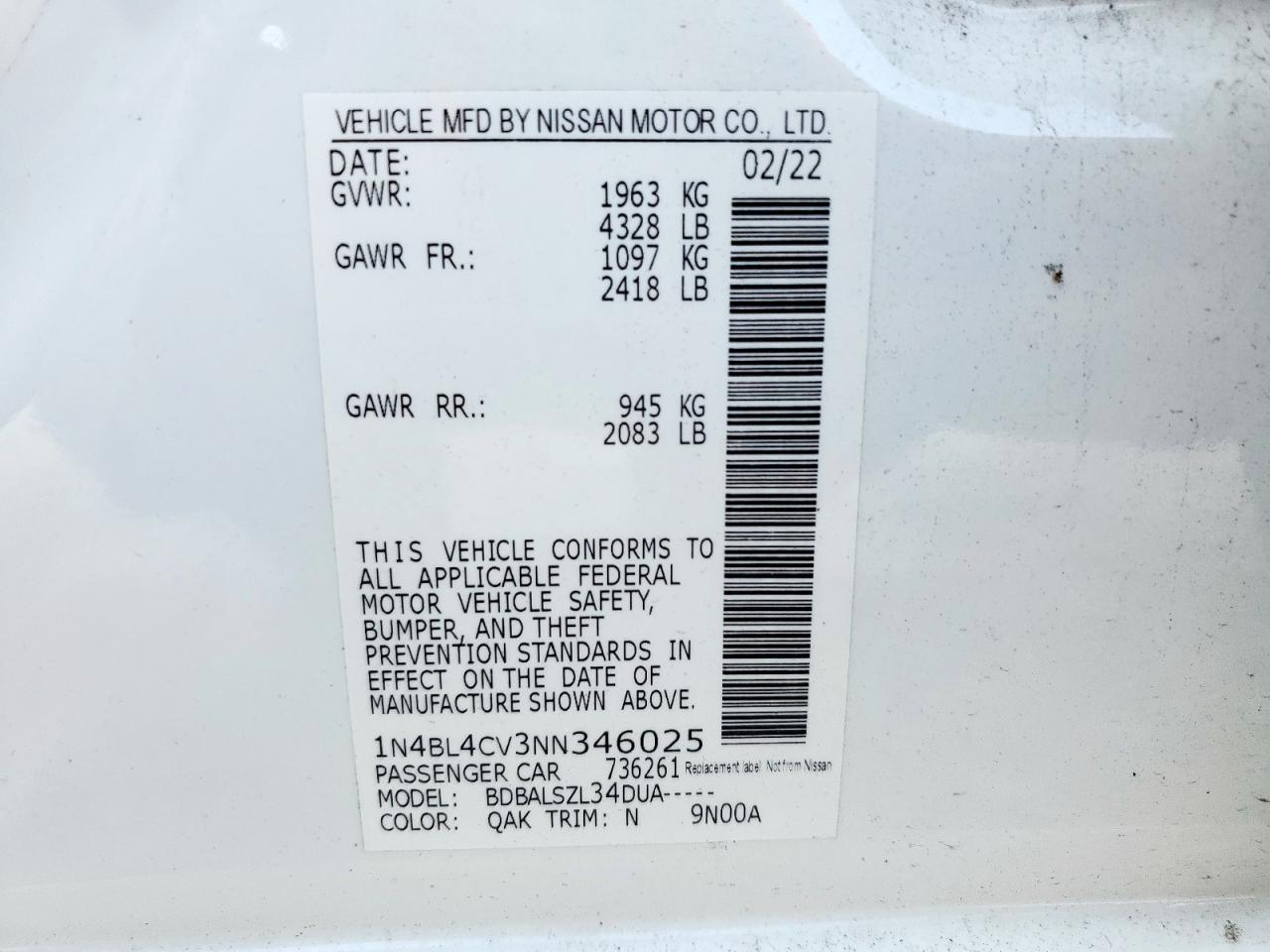 NISSAN ALTIMA 2.5 2022 г.в., (1N4BL4CV3NN346025) из США