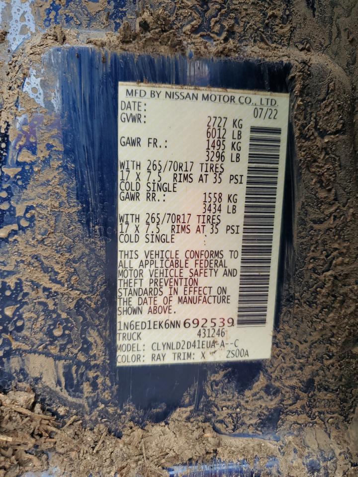 Цвет СинийЦилиндры 6Привод 4x4 с задним приводомVIN 1N6ED1EK6NN692539Состояние Заводится и едет (проверено)Повреждение ВодаДата аукциона 2025-11-06