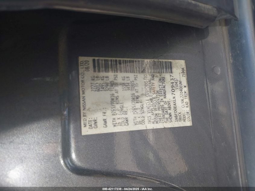 NISSAN FRONTIER 3.8 2020 г.в., (1N6ED0EAXLN709437) из США
