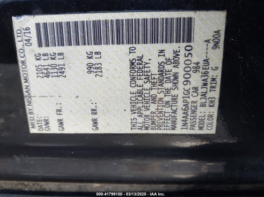 Цвет ЧерныйЦилиндры 6Привод Передний приводVIN 1N4AA6AP1GC900050Состояние СтационарноПовреждение Неизвестно