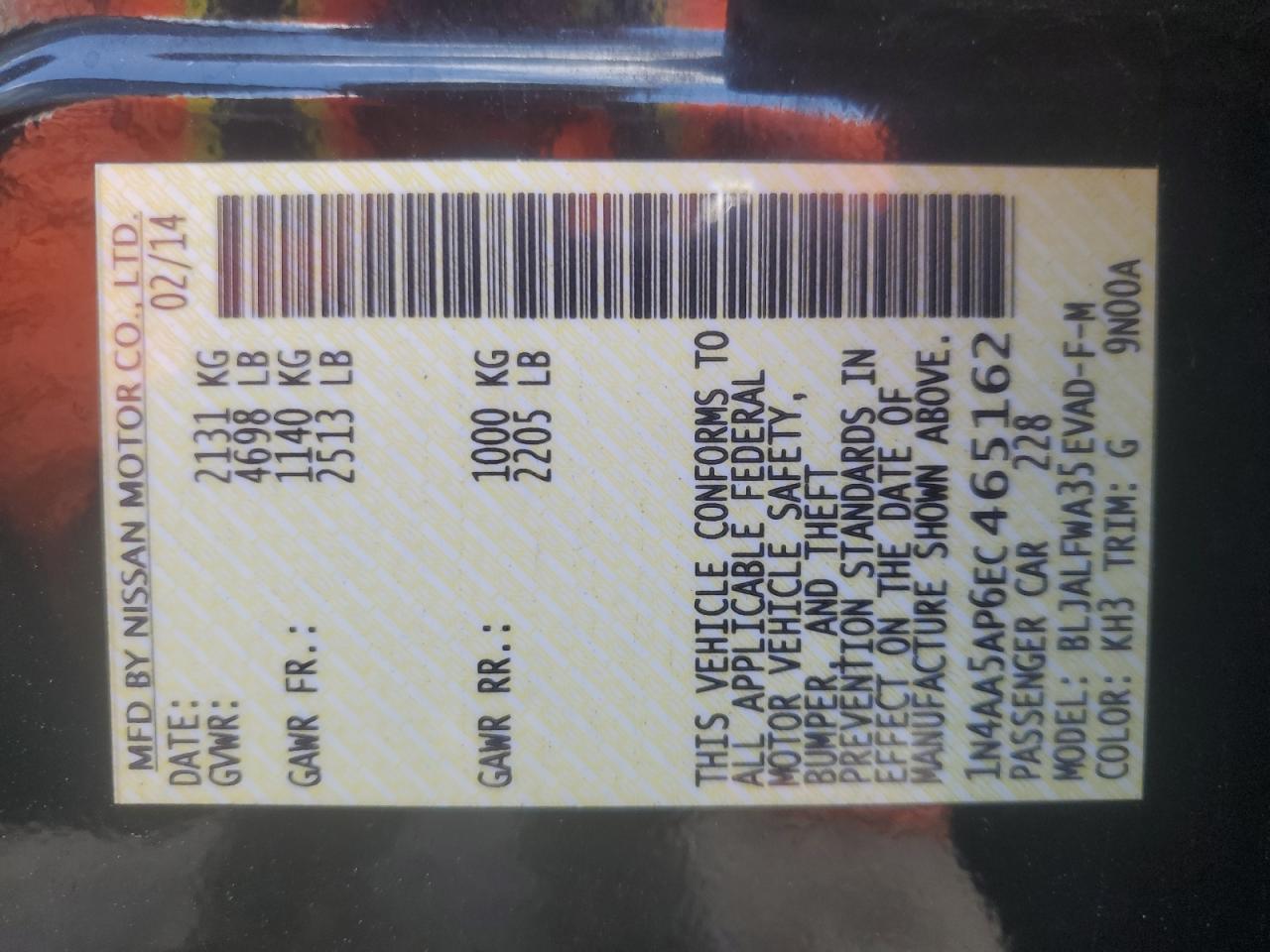 Цвет ЧерныйЦилиндры 6VIN 1N4AA5AP6EC465162Состояние Заводится и едет (проверено)Повреждение Передняя или задняя