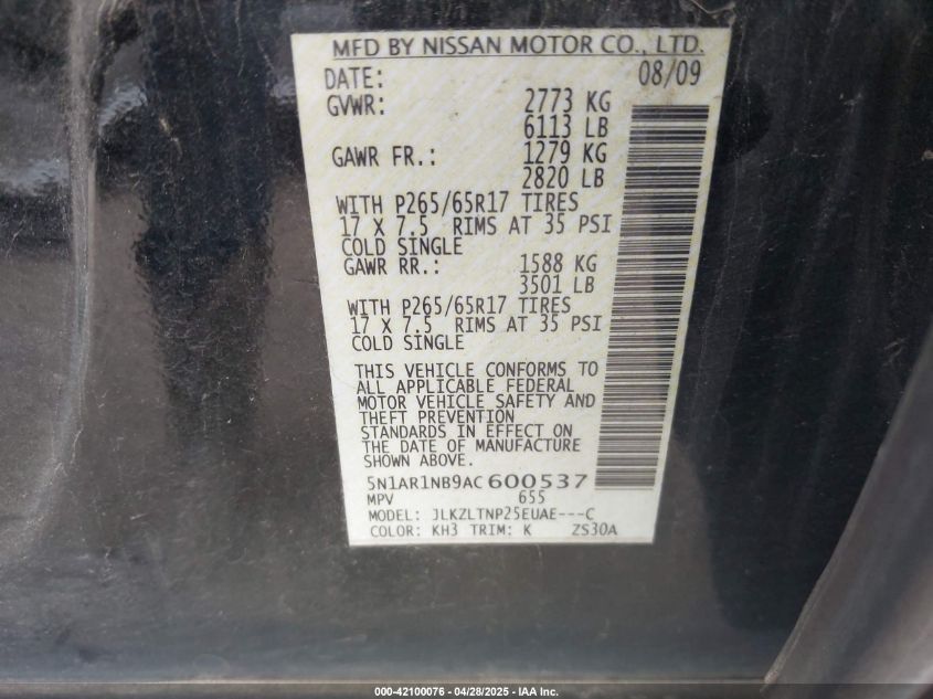 NISSAN PATHFINDER 4.0 2010 г.в., Полный привод (5N1AR1NB9AC600537) из США