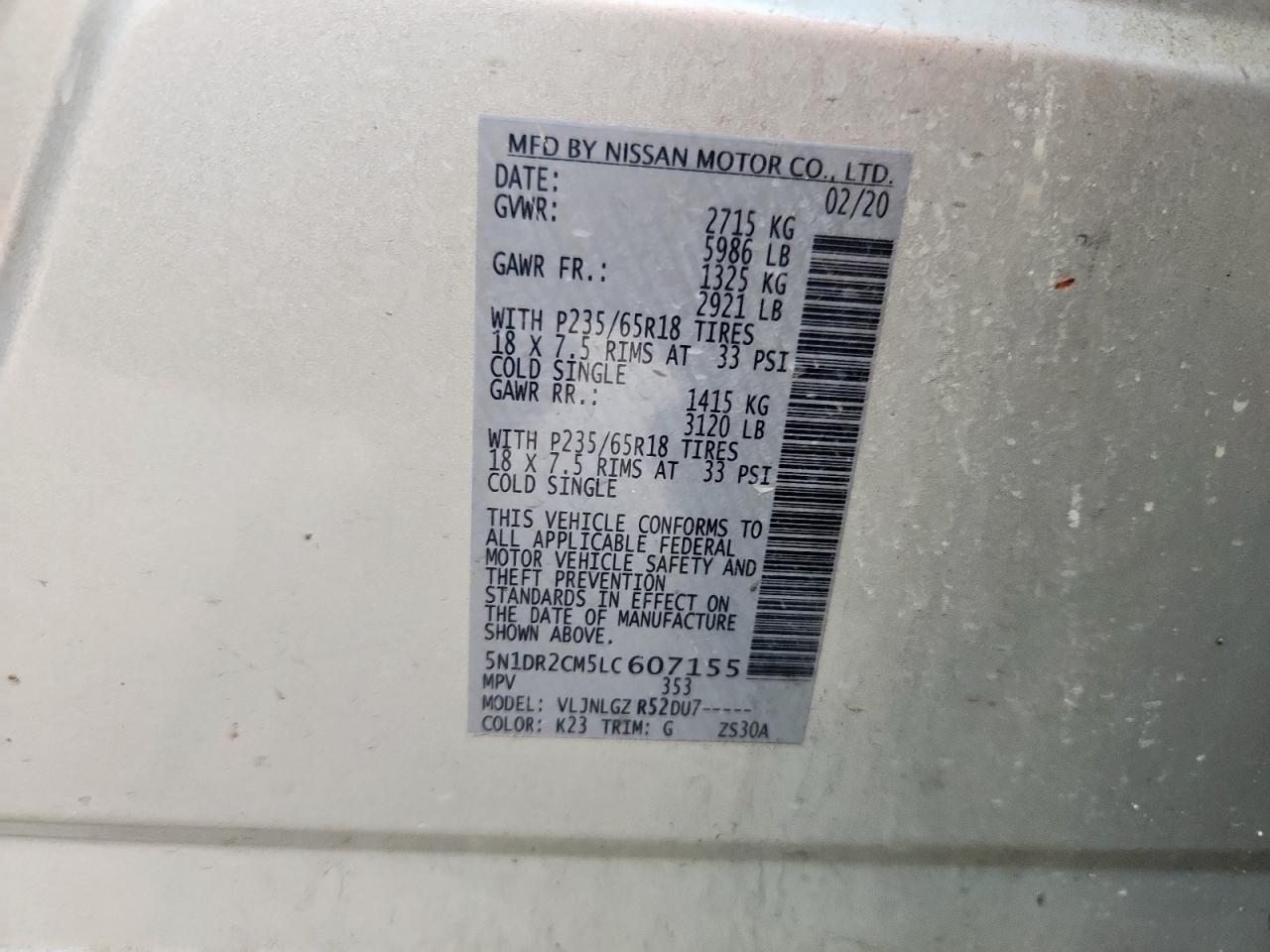 NISSAN PATHFINDER 3.5 2020 г.в., 4x4 с передним приводом (5N1DR2CM5LC607155) из США