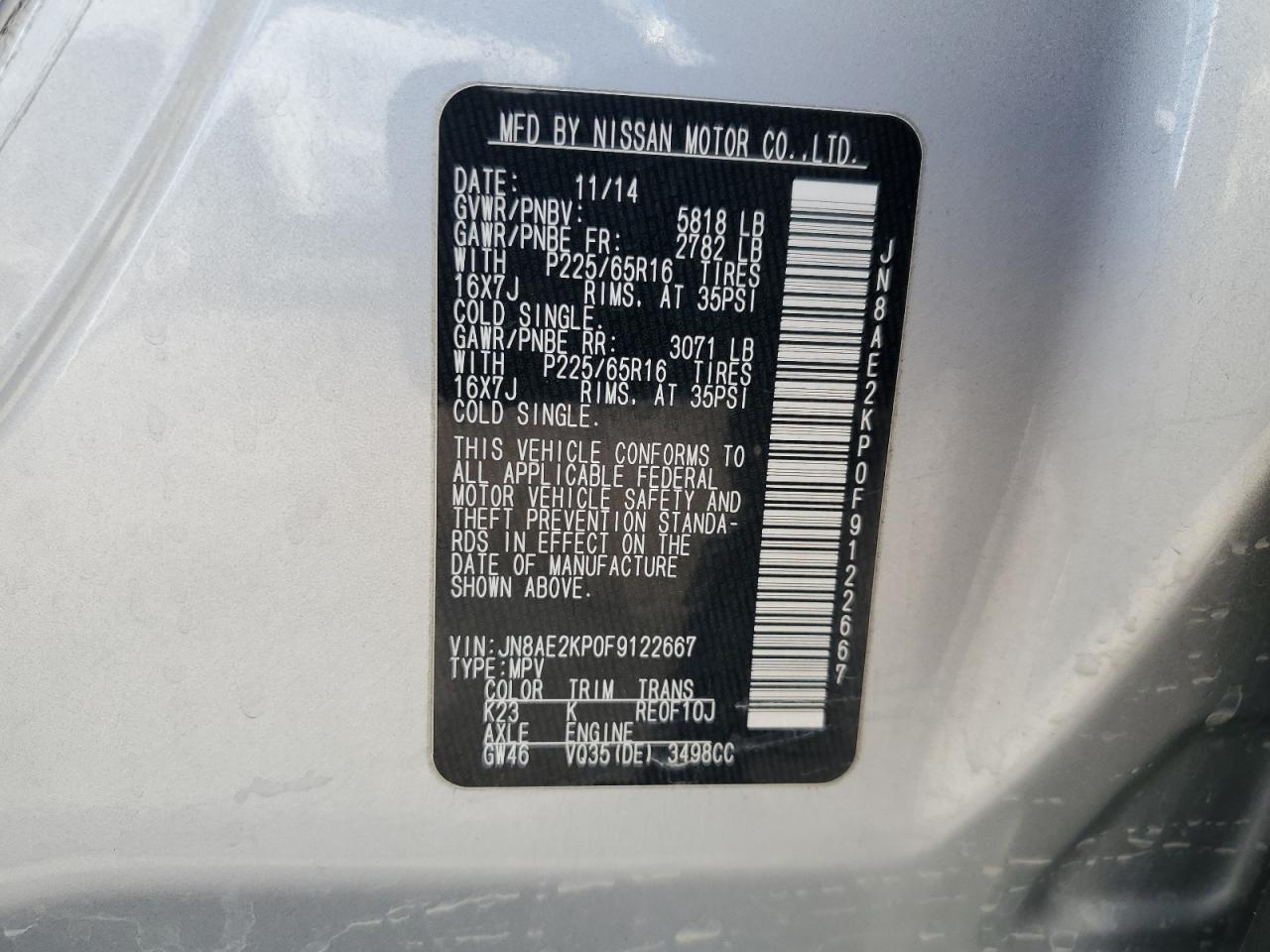 NISSAN QUEST 3.5 2015 г.в., (JN8AE2KP0F9122667) из США