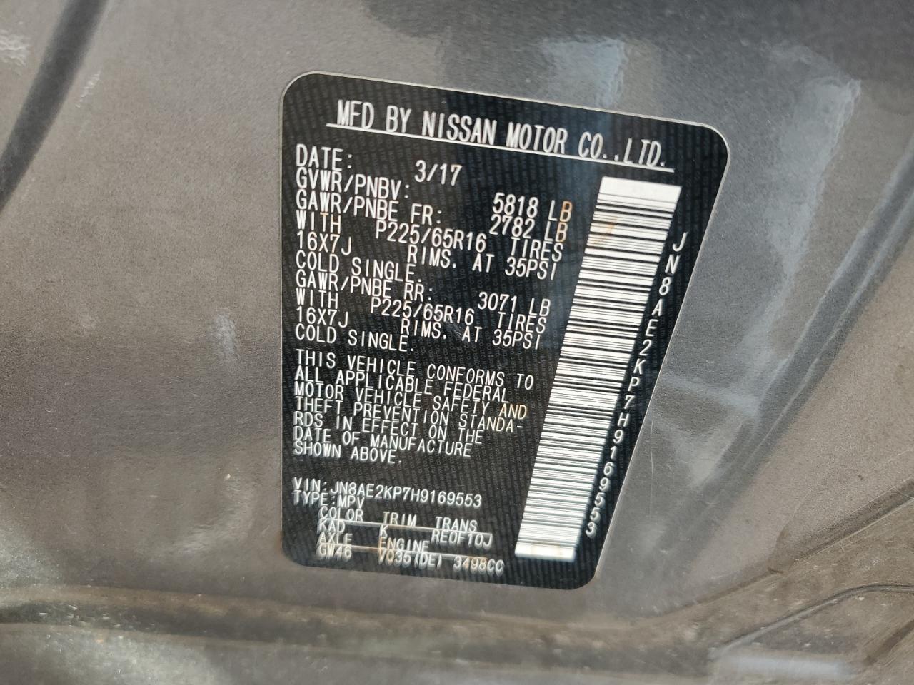 NISSAN QUEST 3.5 2017 г.в., (JN8AE2KP7H9169553) из США