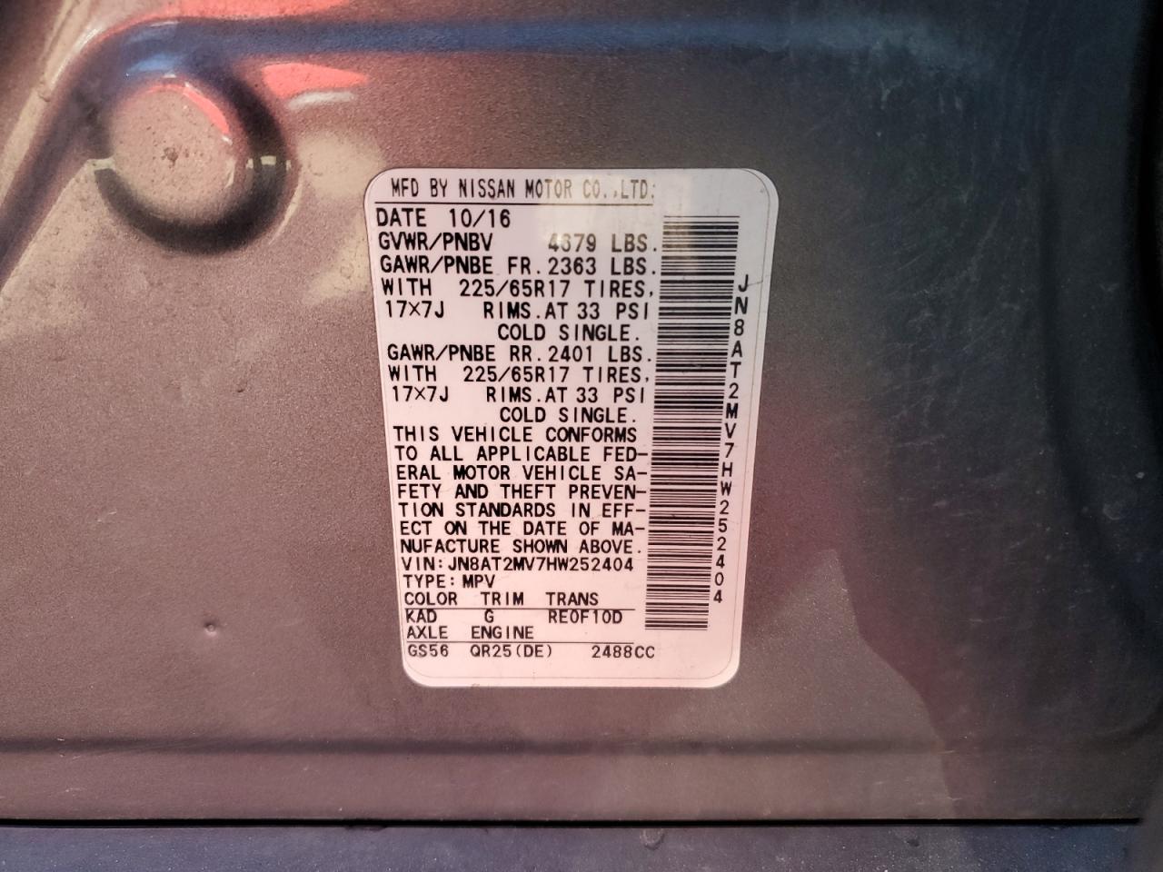 NISSAN ROGUE 2.5 2017 г.в., Полный привод (JN8AT2MV7HW252404) из США