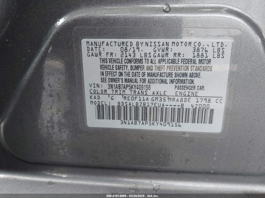 NISSAN SENTRA 1.8 2019 г.в., Передний привод (3N1AB7AP5KY409156) из США