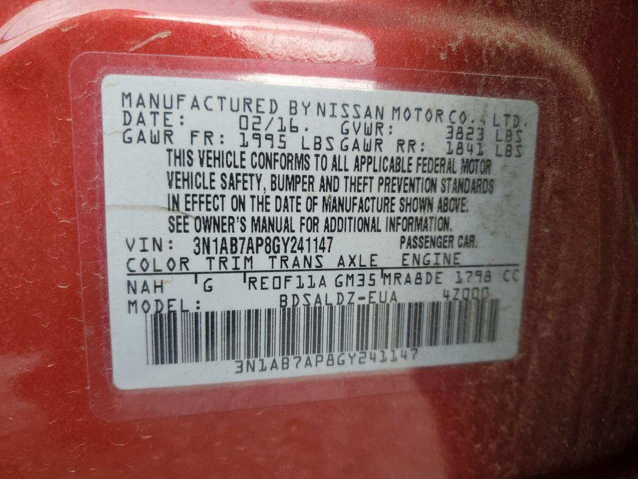NISSAN SENTRA 1.8 2016 г.в., (3N1AB7AP8GY241147) из США