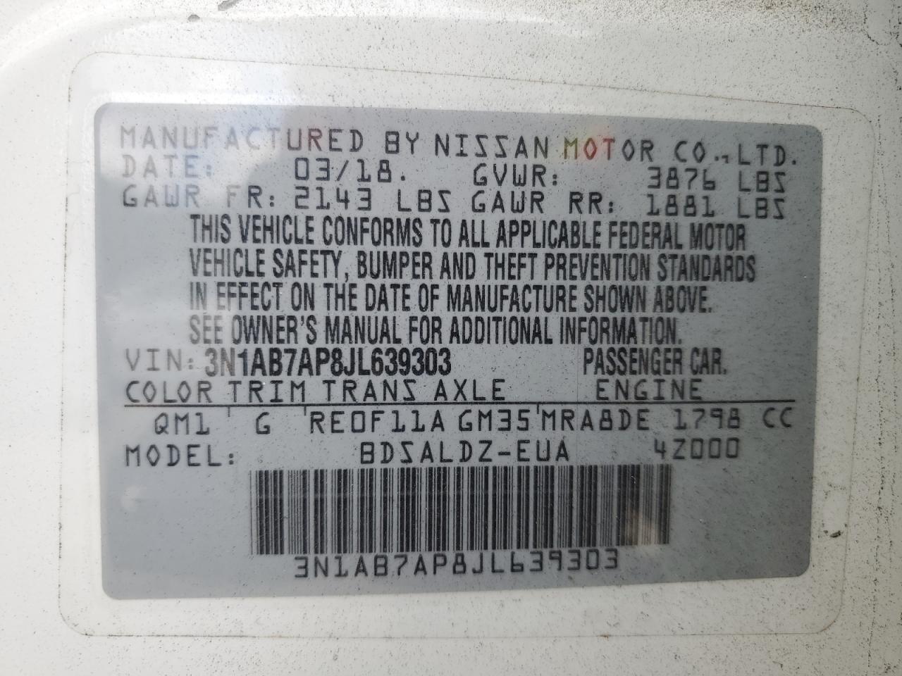 Цвет БелыйЦилиндры 4VIN 3N1AB7AP8JL639303Состояние Заводится и едет (проверено)Повреждение Передняя или задняя