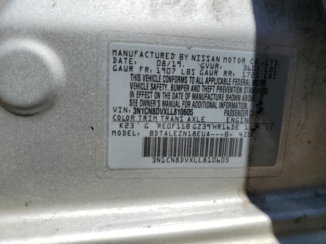 Цвет СеребряныйЦилиндры 4VIN 3N1CN8DVXLL810605Состояние НеизвестноПовреждение Передняя или задняя