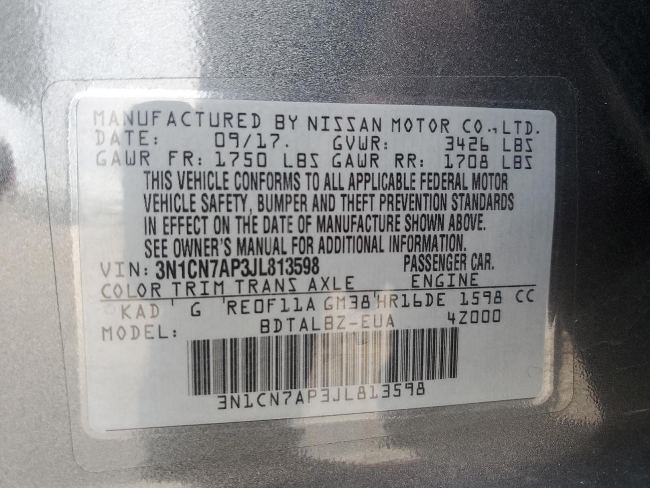 Цвет СерыйЦилиндры 4VIN 3N1CN7AP3JL813598Состояние НеизвестноПовреждение Передняя или задняя