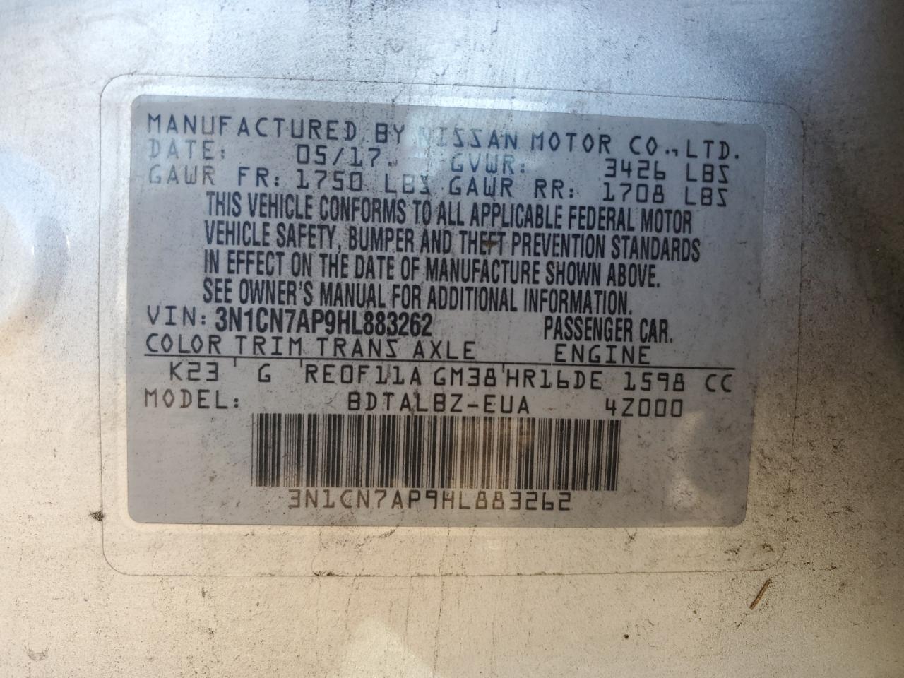 NISSAN VERSA 1.6 2017 г.в., (3N1CN7AP9HL883262) из США