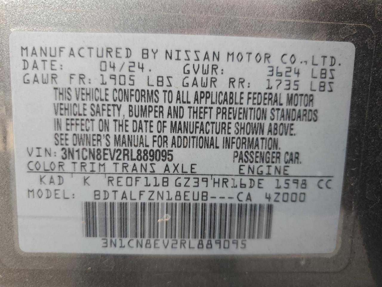 Цвет СерыйЦилиндры 4VIN 3N1CN8EV2RL889095Состояние НеизвестноПовреждение По всему автоДата аукциона 2025-11-03
