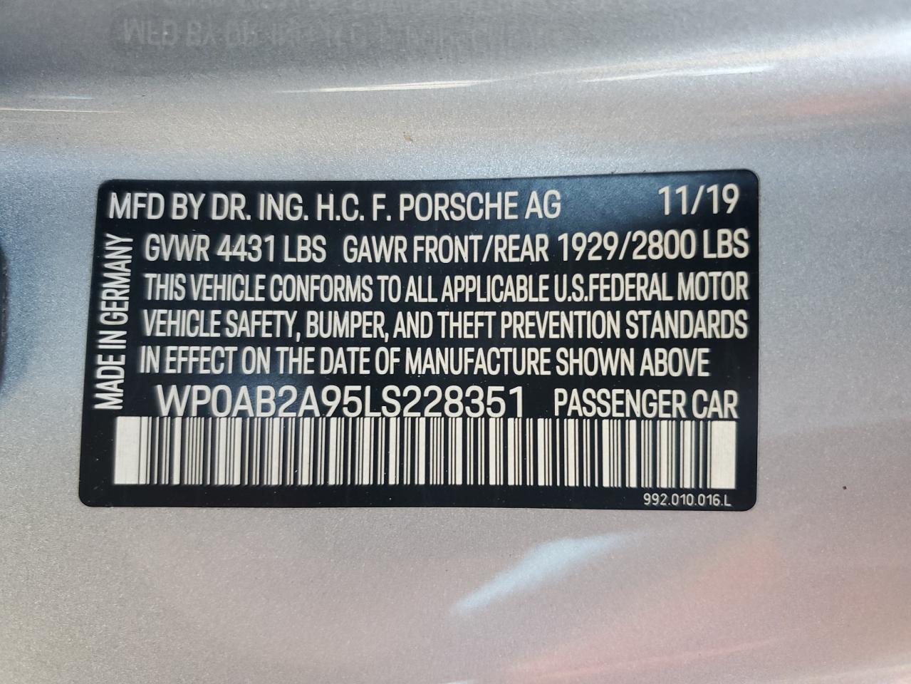 PORSCHE 911 3.0 2020 г.в., Задний привод (WP0AB2A95LS228351) из США