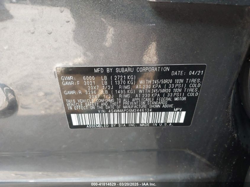 SUBARU ASCENT 2.4 2021 г.в., Полный привод (4S4WMAPD6M3446134) из США