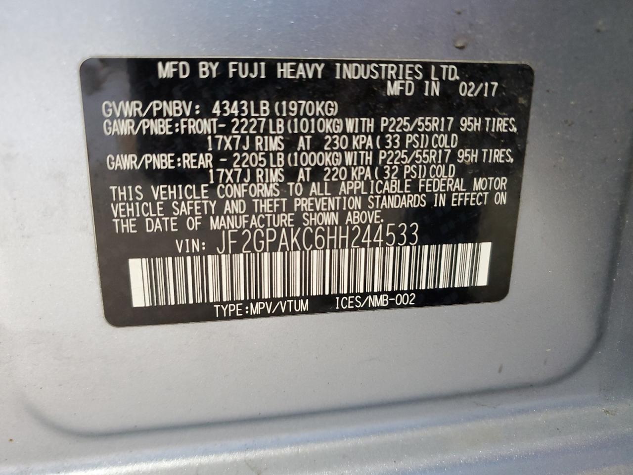 SUBARU CROSSTREK 2.0 2017 г.в., Полный привод (JF2GPAKC6HH244533) из США