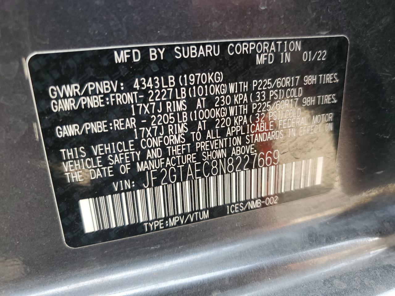 SUBARU CROSSTREK 2.0 2022 г.в., Полный привод (JF2GTAEC8N8227669) из США