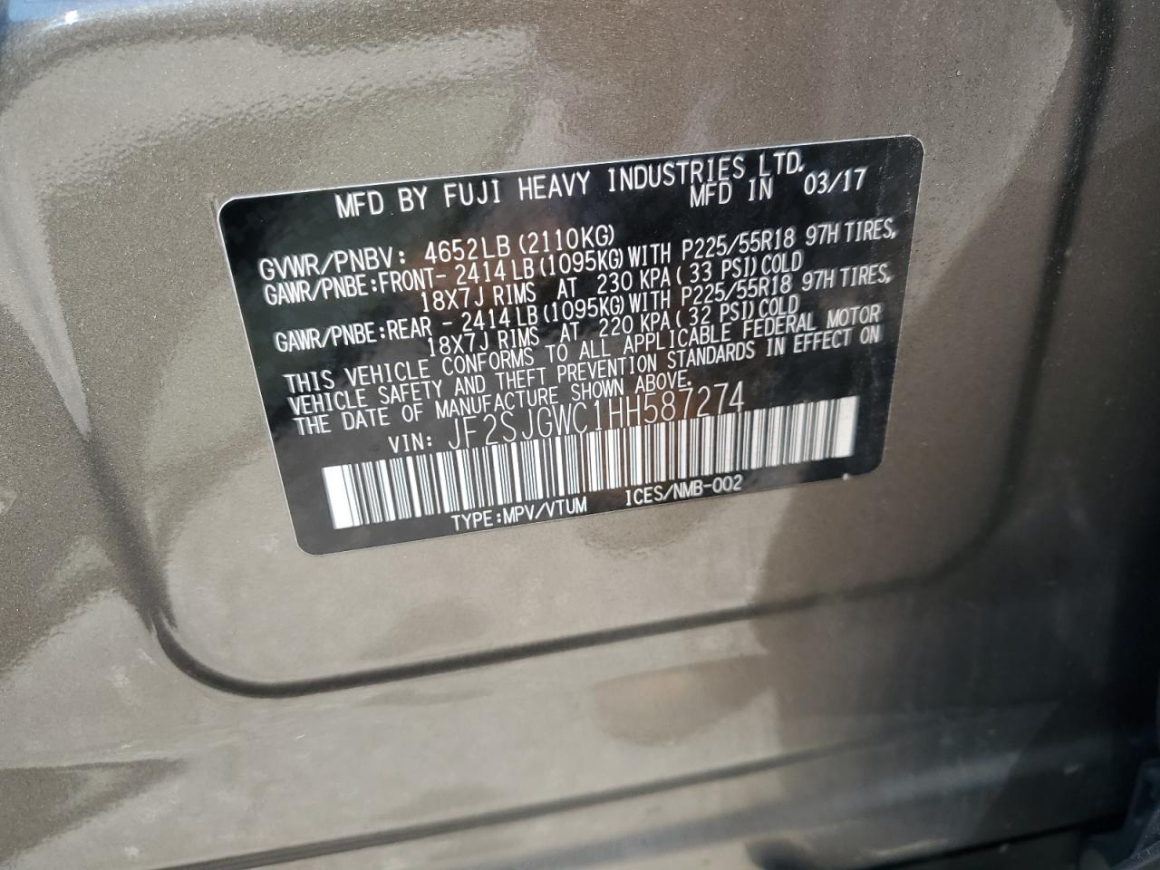 SUBARU FORESTER 2.0 2017 г.в., Полный привод (JF2SJGWC1HH587274) из США