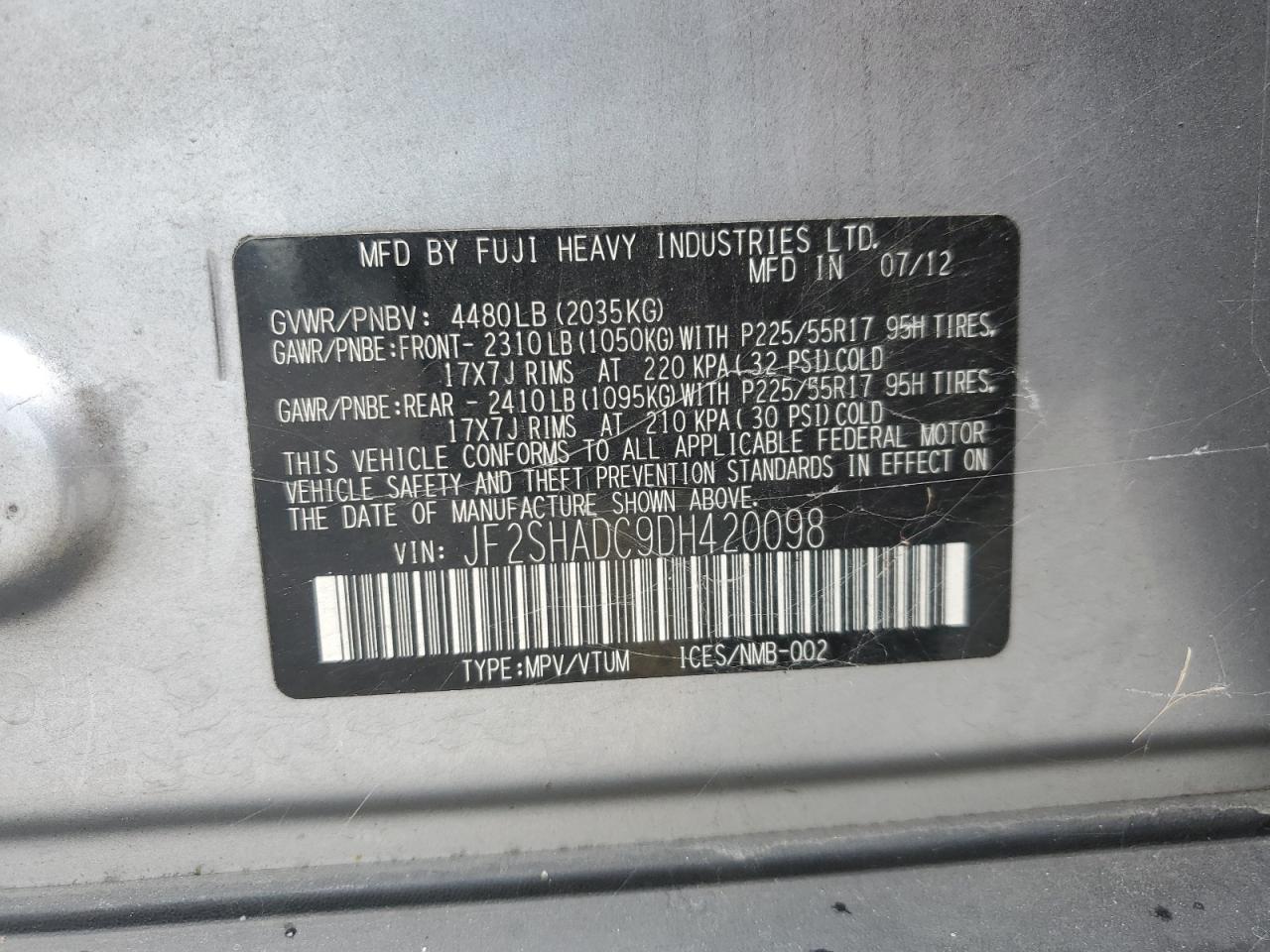 Цвет СеребряныйЦилиндры 4Привод Полный приводVIN JF2SHADC9DH420098Состояние Заводится и едет (проверено)Повреждение Задняя