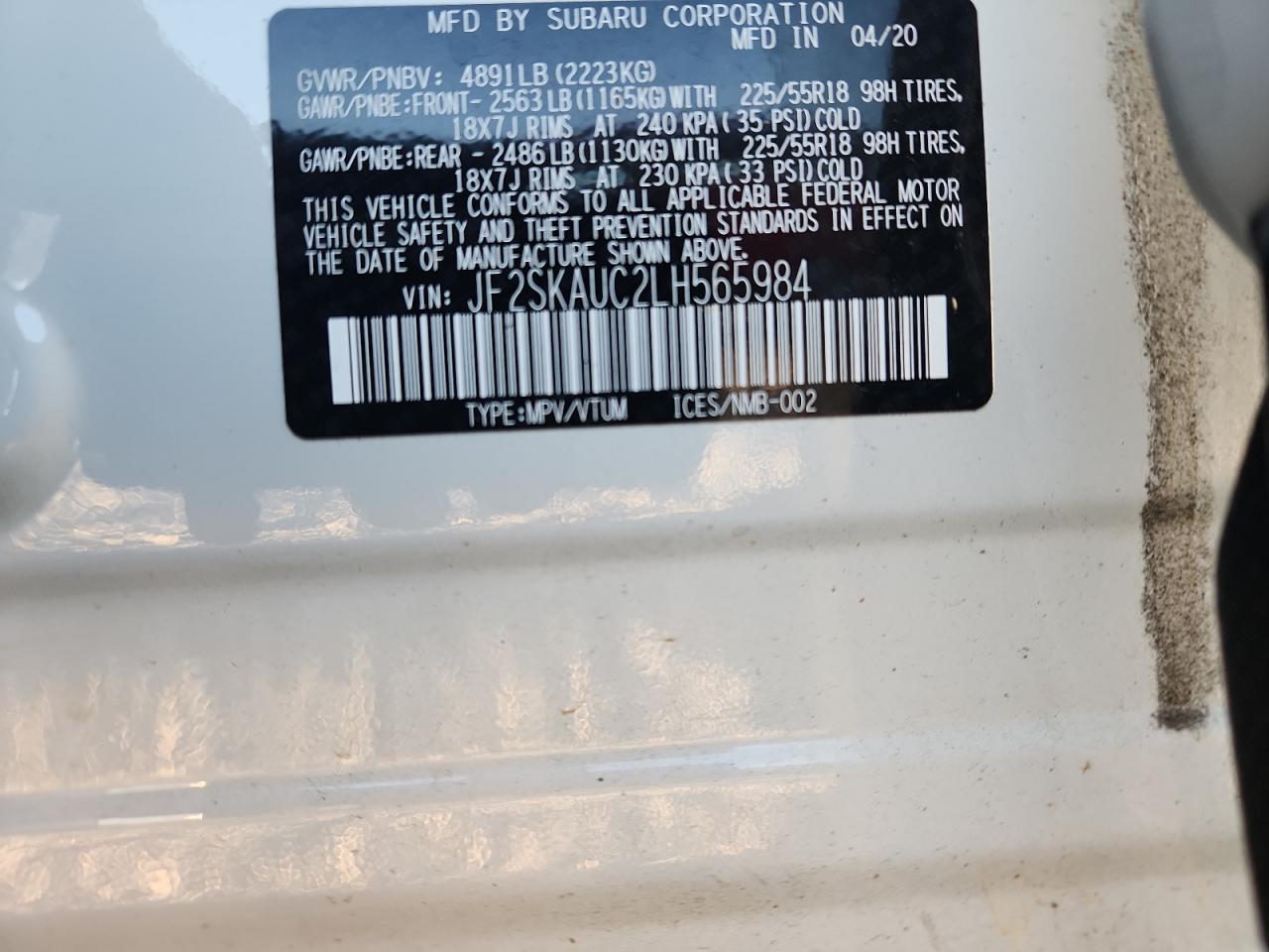 SUBARU FORESTER 2.5 2020 г.в., Полный привод (JF2SKAUC2LH565984) из США