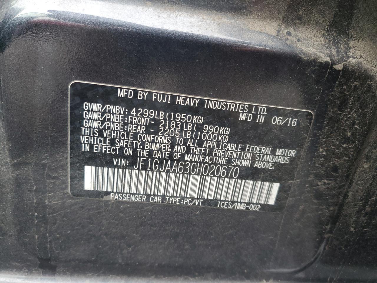 SUBARU IMPREZA 2.0 2016 г.в., Полный привод (JF1GJAA63GH020670) из США