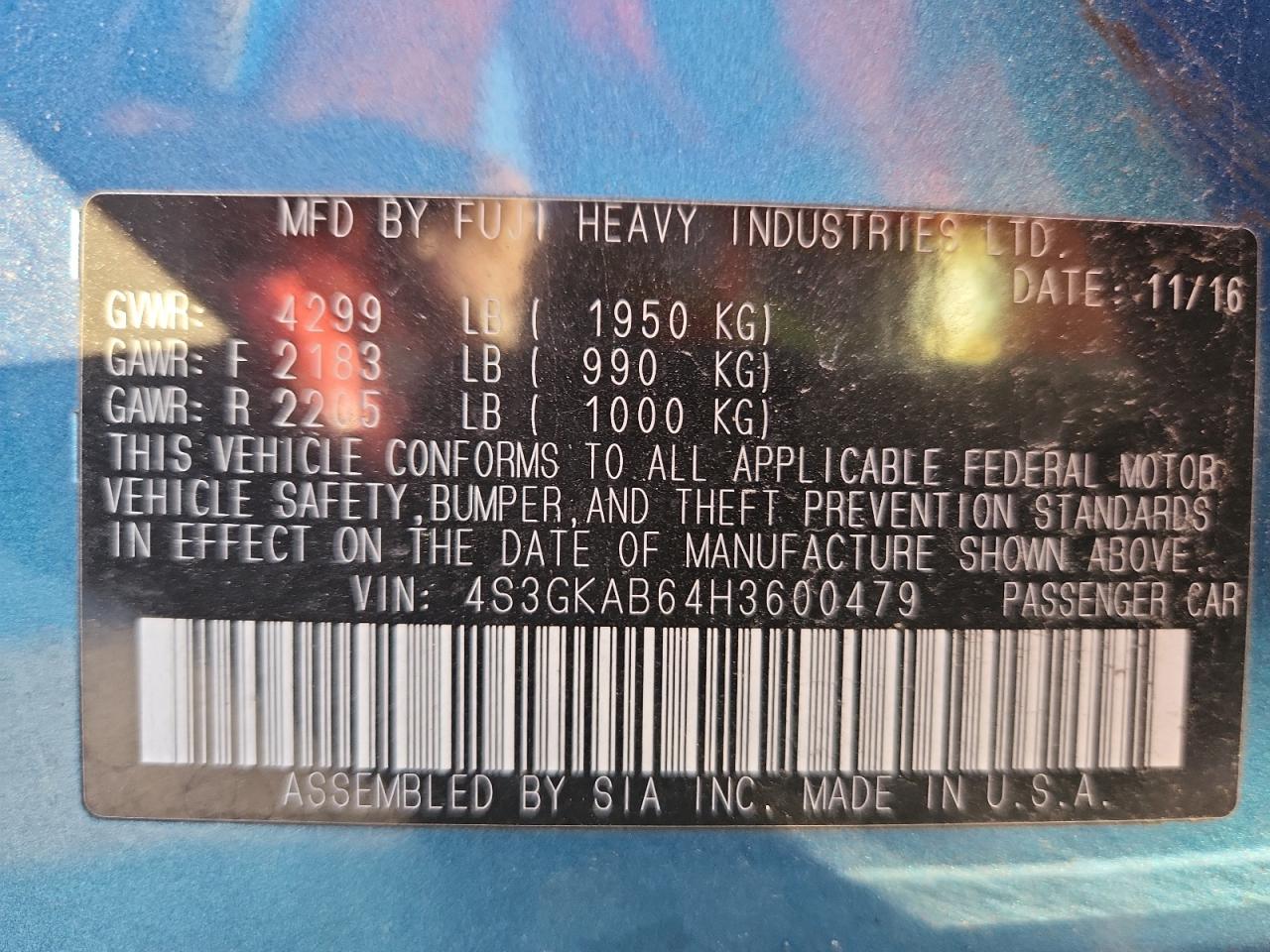 SUBARU IMPREZA 2.0 2017 г.в., Полный привод (4S3GKAB64H3600479) из США