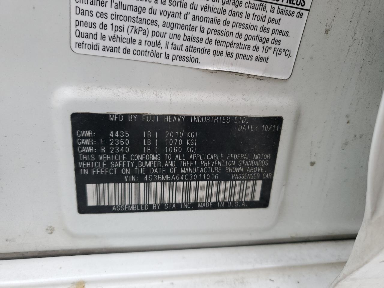 SUBARU LEGACY 2.5 2012 г.в., Полный привод (4S3BMBA64C3011016) из США