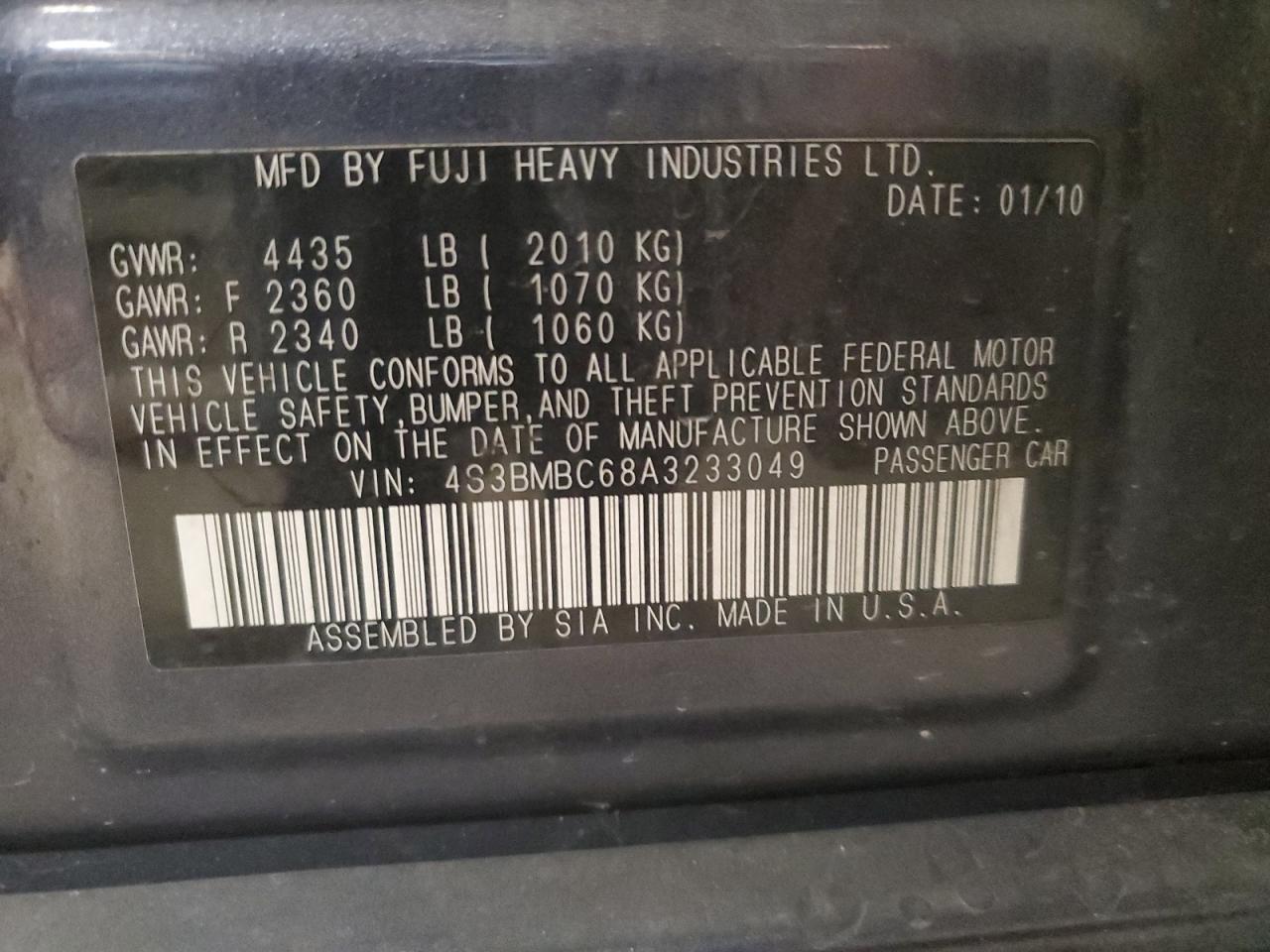 SUBARU LEGACY 2.5 2010 г.в., Полный привод (4S3BMBC68A3233049) из США