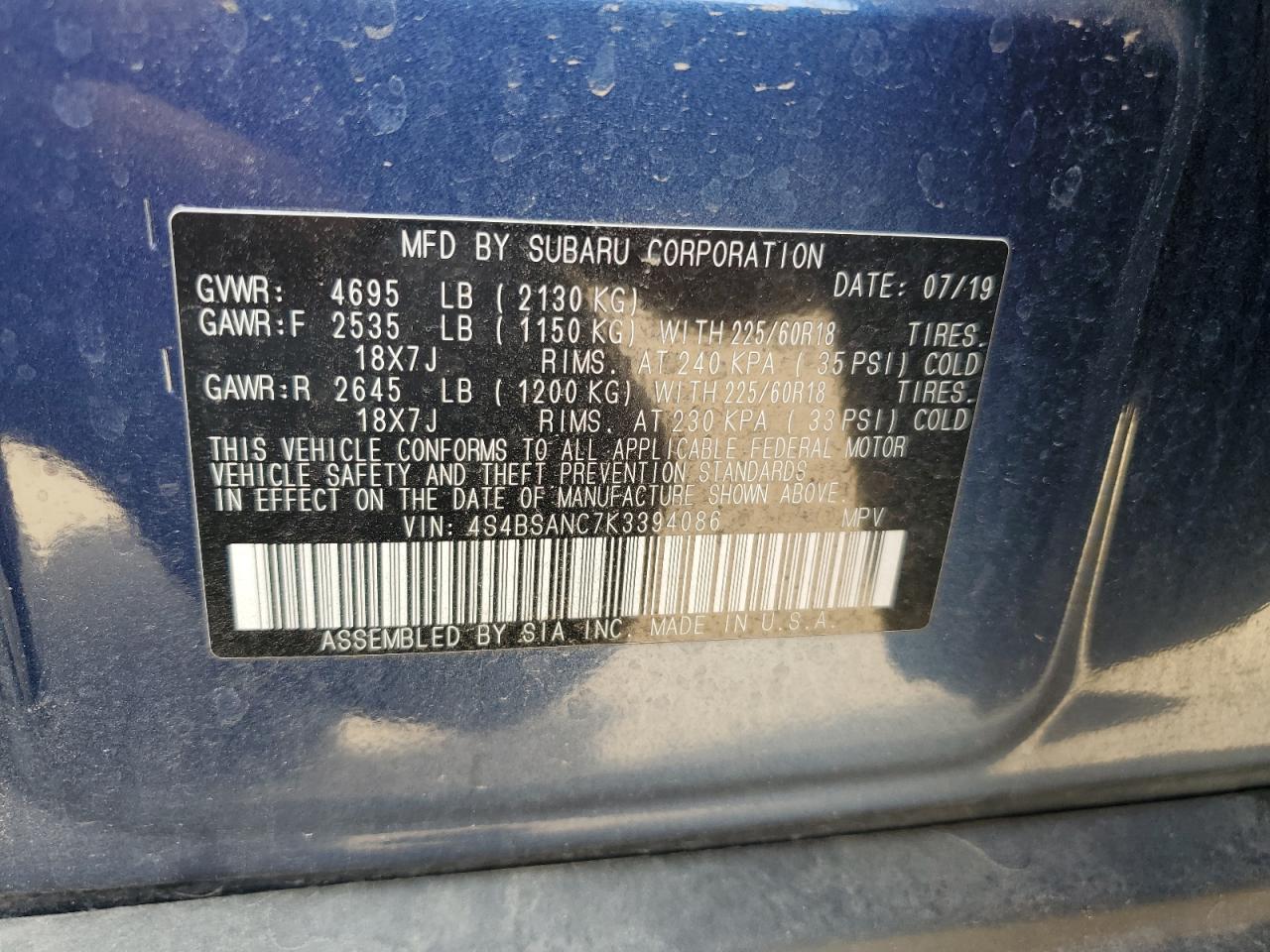 SUBARU OUTBACK 2.5 2019 г.в., Полный привод (4S4BSANC7K3394086) из США