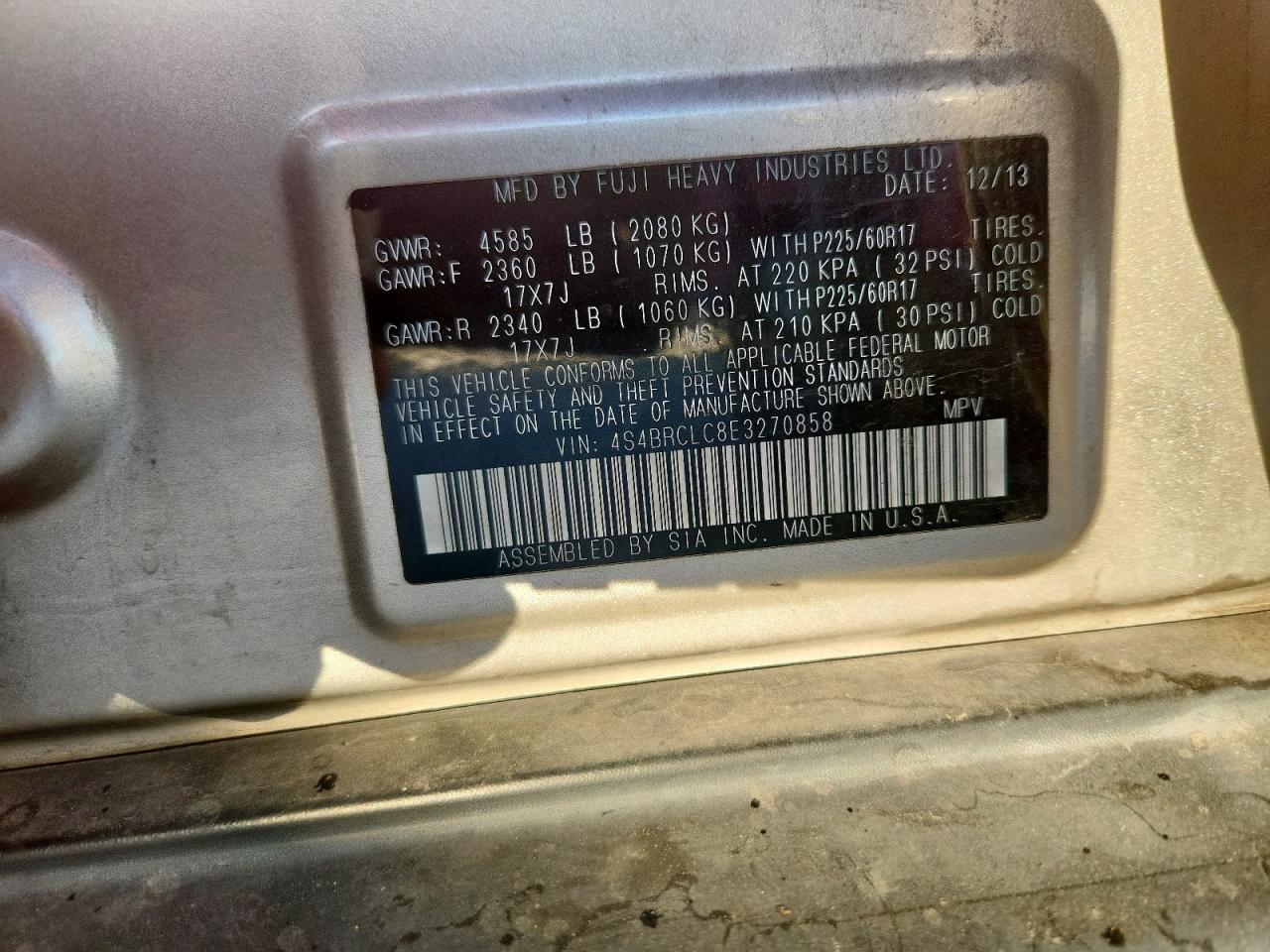 SUBARU OUTBACK 2.5 2014 г.в., Полный привод (4S4BRCLC8E3270858) из США