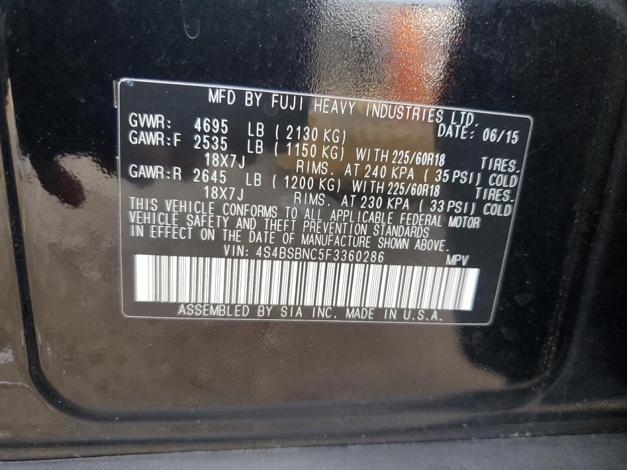 SUBARU OUTBACK 2.5 2015 г.в., Полный привод (4S4BSBNC5F3360286) из США