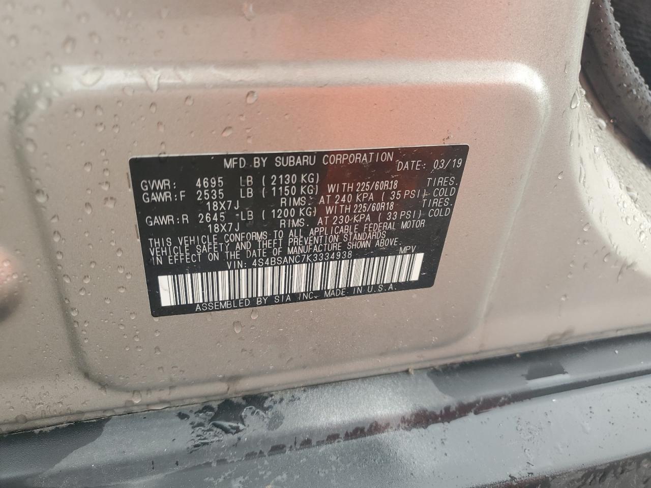 SUBARU OUTBACK 2.5 2019 г.в., Полный привод (4S4BSANC7K3334938) из США