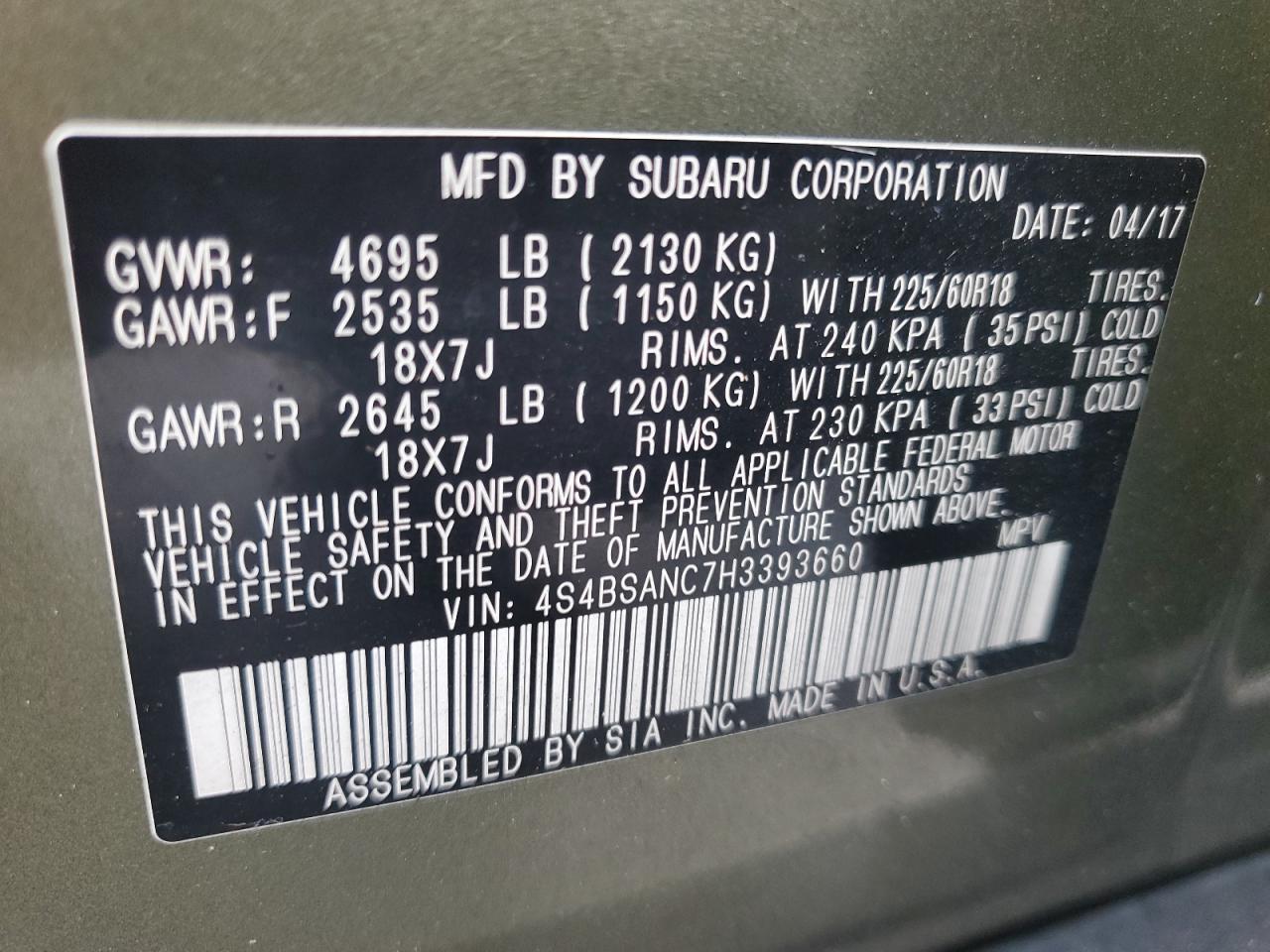 SUBARU OUTBACK 2.5 2017 г.в., Полный привод (4S4BSANC7H3393660) из США