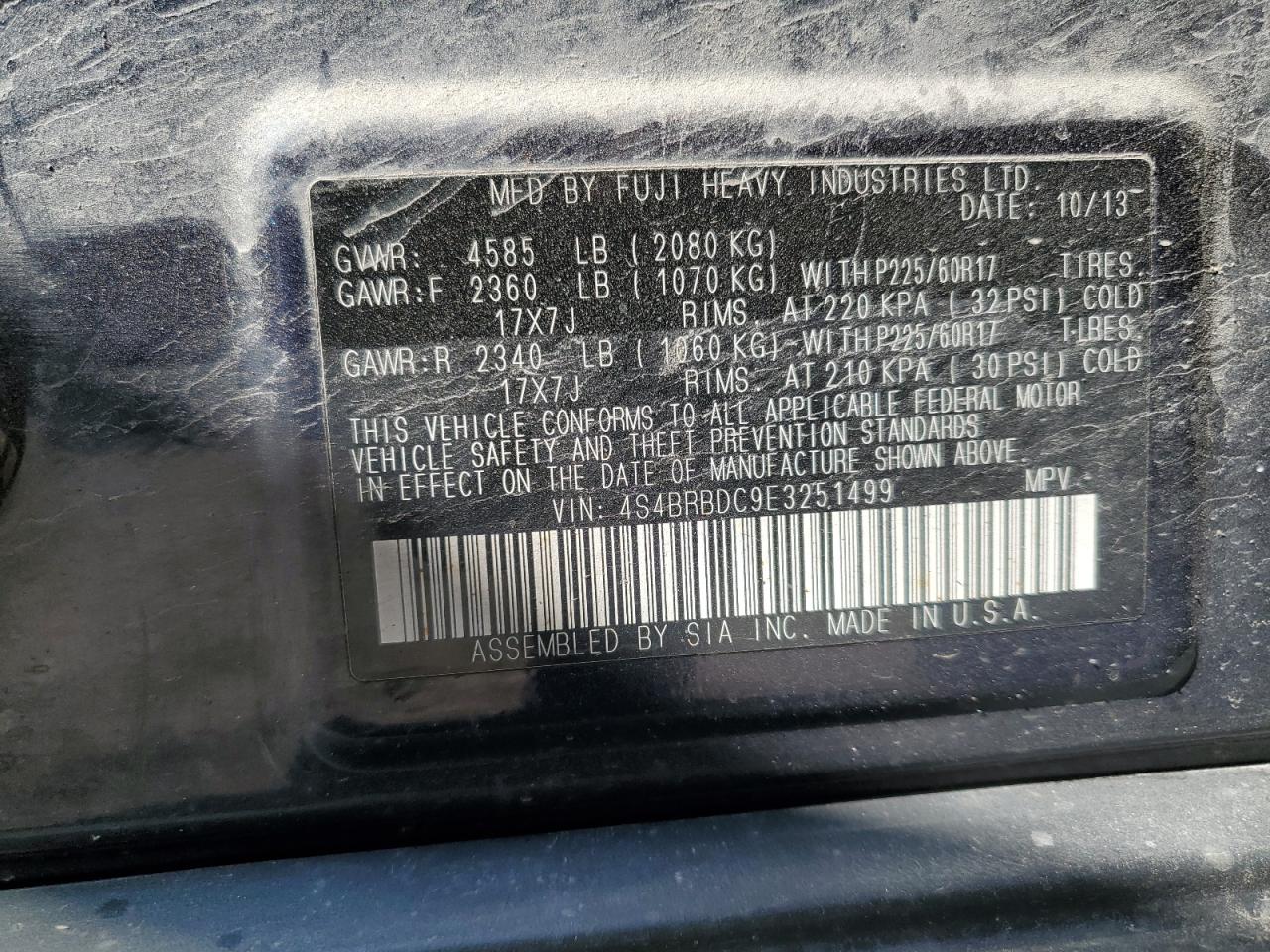 SUBARU OUTBACK 2.5 2014 г.в., Полный привод (4S4BRBDC9E3251499) из США