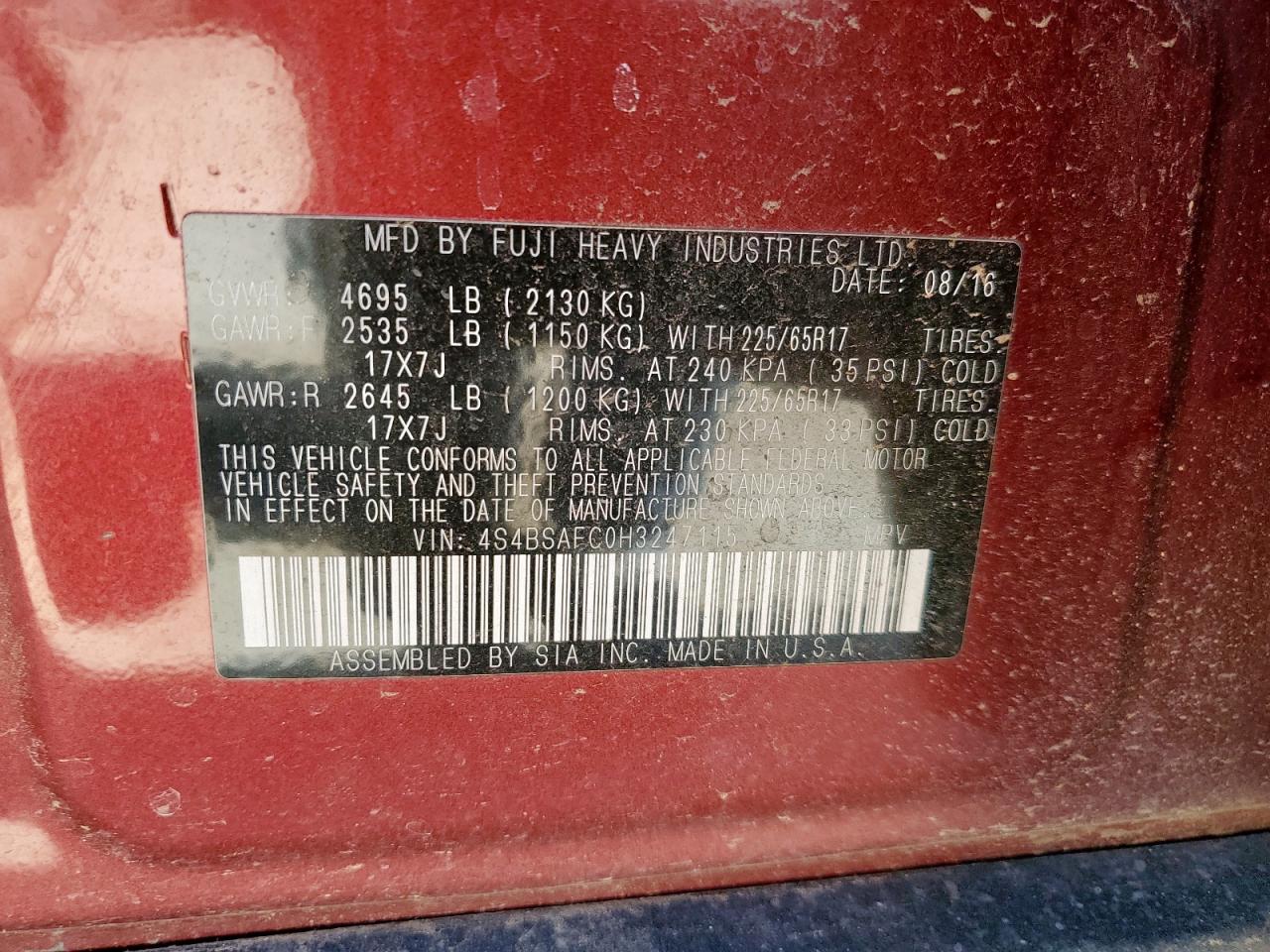 SUBARU OUTBACK 2.5 2017 г.в., Полный привод (4S4BSAFC0H3247115) из США