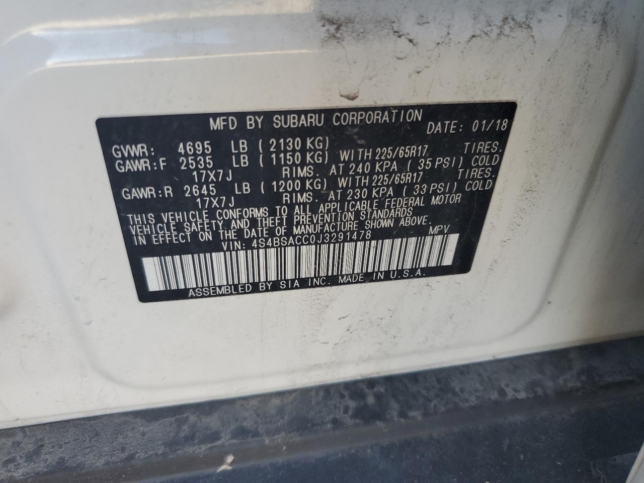 SUBARU OUTBACK 2.5 2018 г.в., Полный привод (4S4BSACC0J3291478) из США