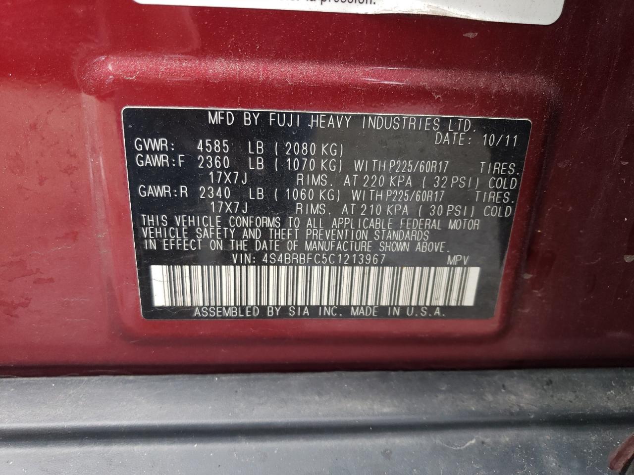 SUBARU OUTBACK 2.5 2012 г.в., Полный привод (4S4BRBFC5C1213967) из США