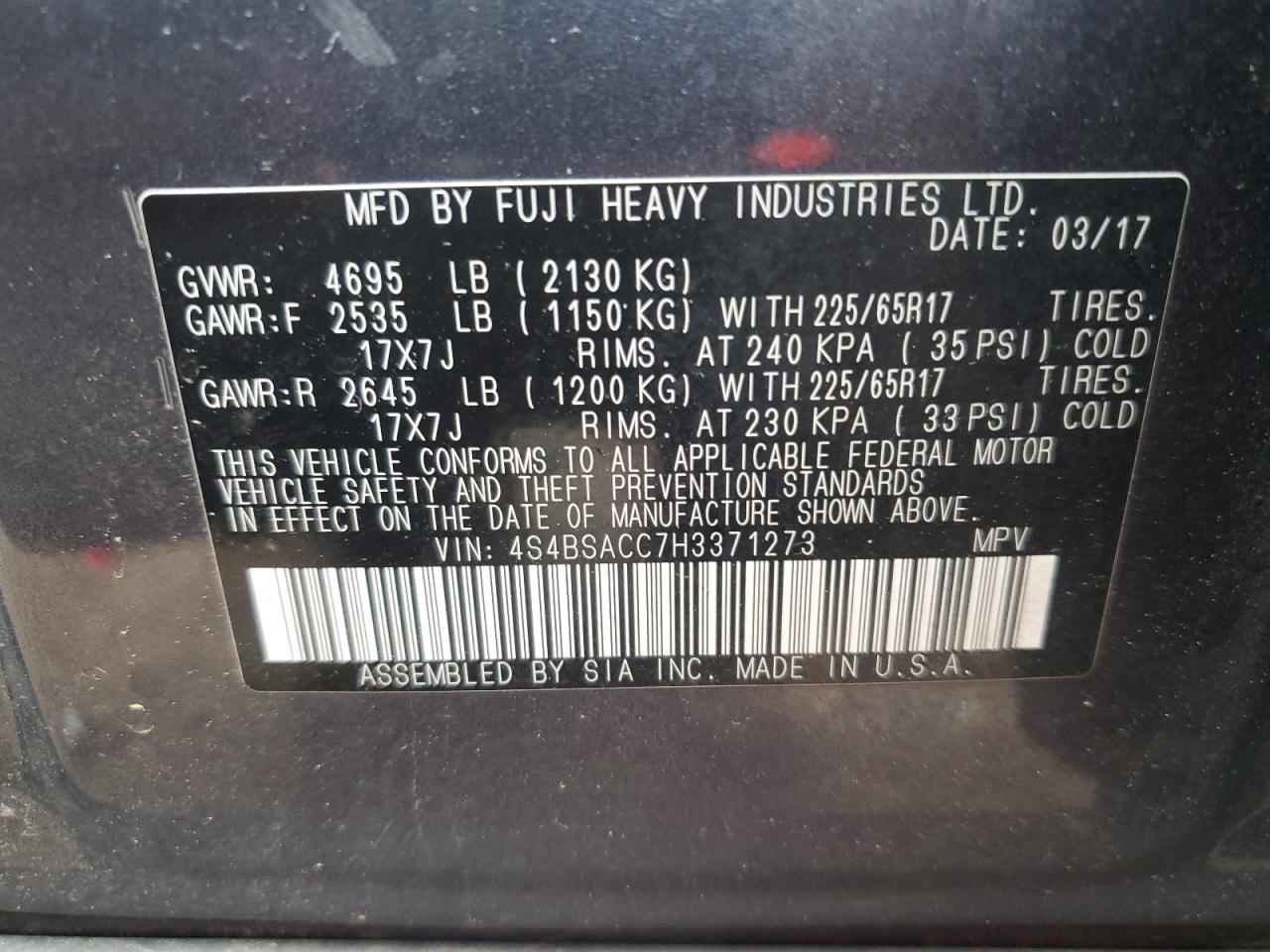 SUBARU OUTBACK 2.5 2017 г.в., Полный привод (4S4BSACC7H3371273) из США