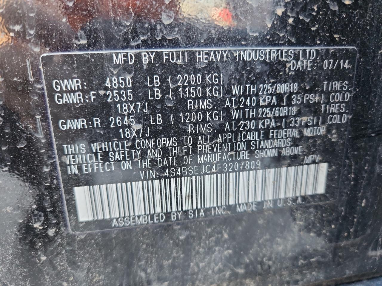 SUBARU OUTBACK 3.6 2015 г.в., Полный привод (4S4BSEJC4F3207809) из США