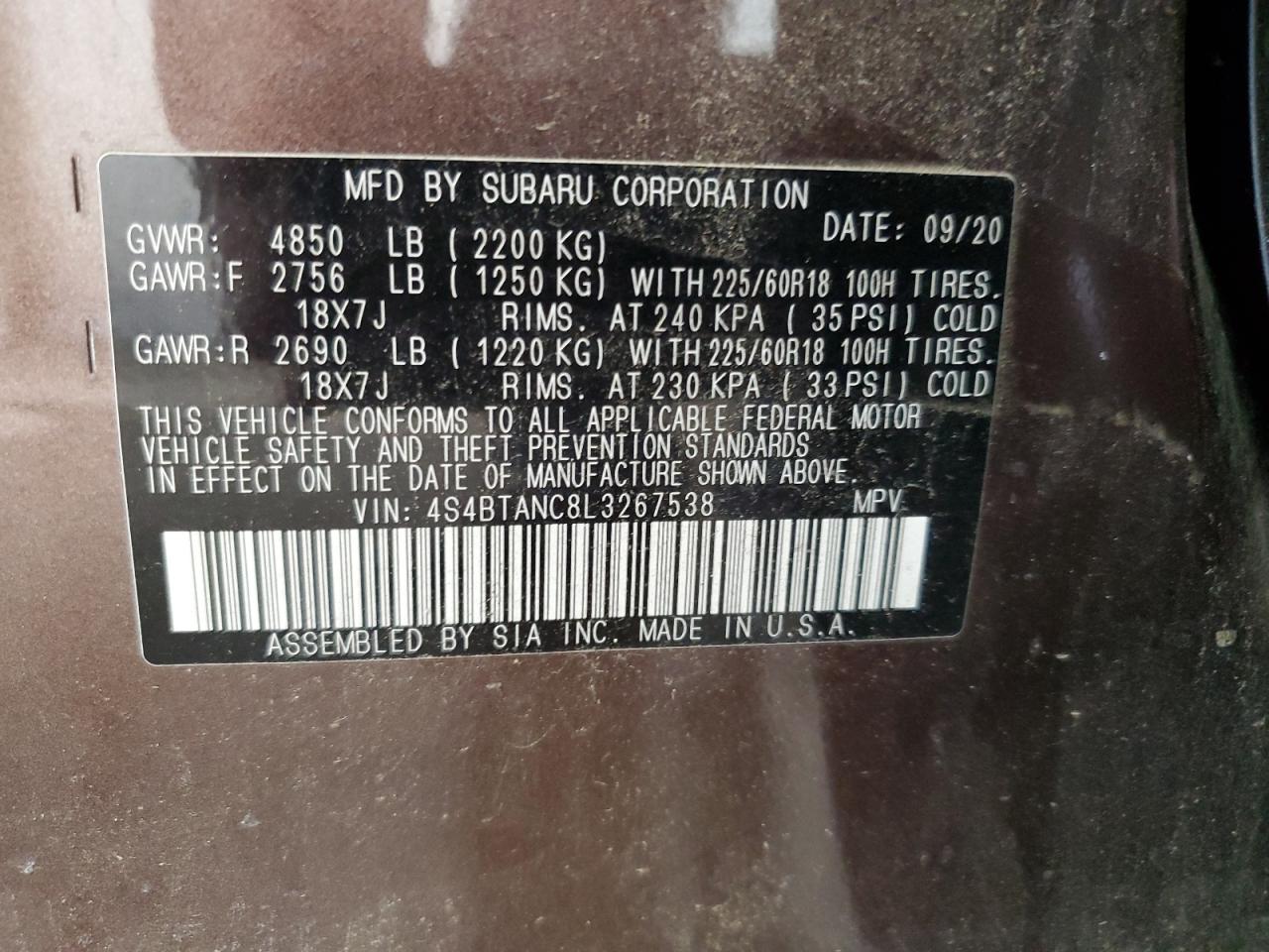 SUBARU OUTBACK 2.5 2020 г.в., Полный привод (4S4BTANC8L3267538) из США