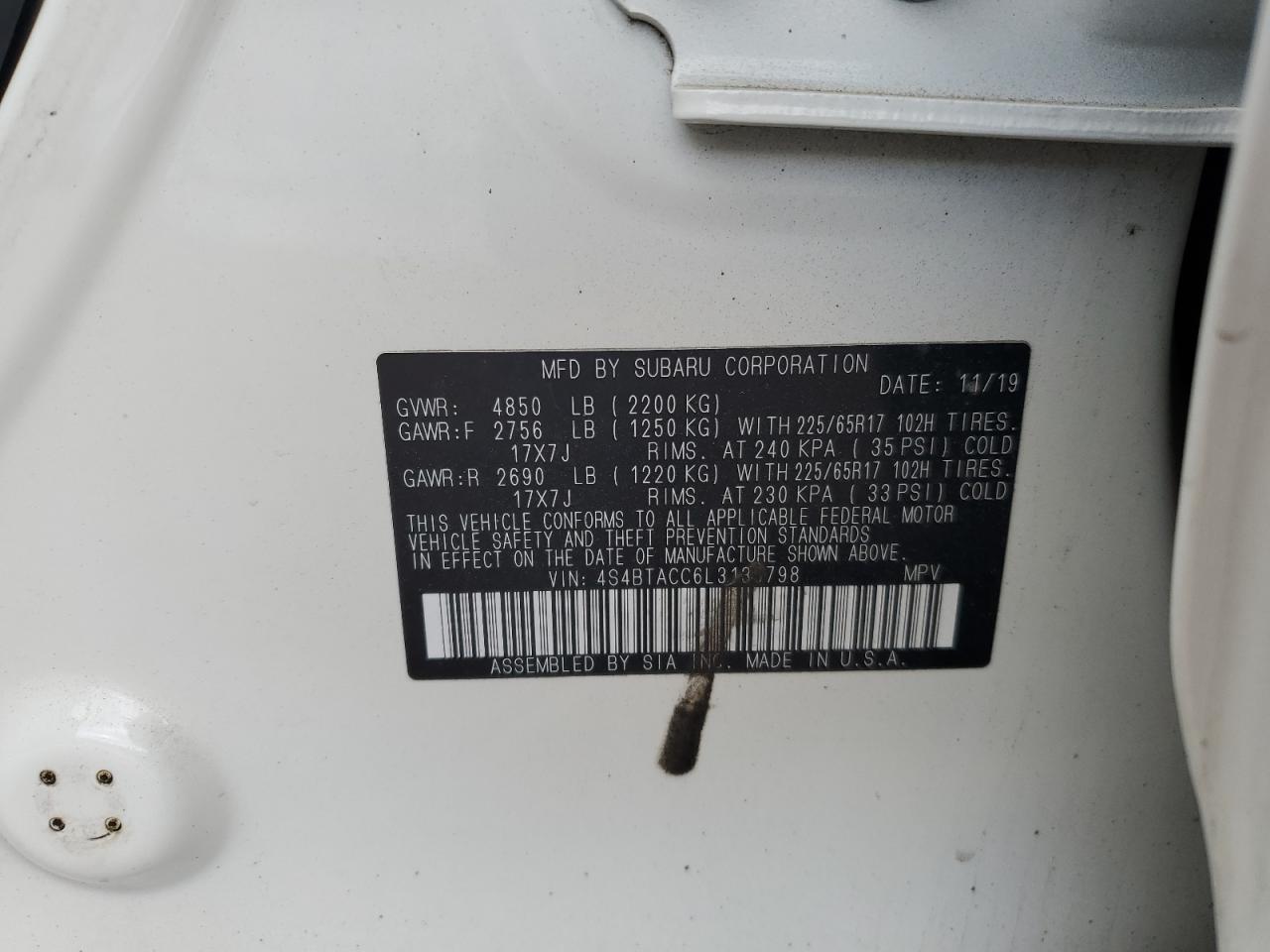 SUBARU OUTBACK 2.5 2020 г.в., Полный привод (4S4BTACC6L3135798) из США