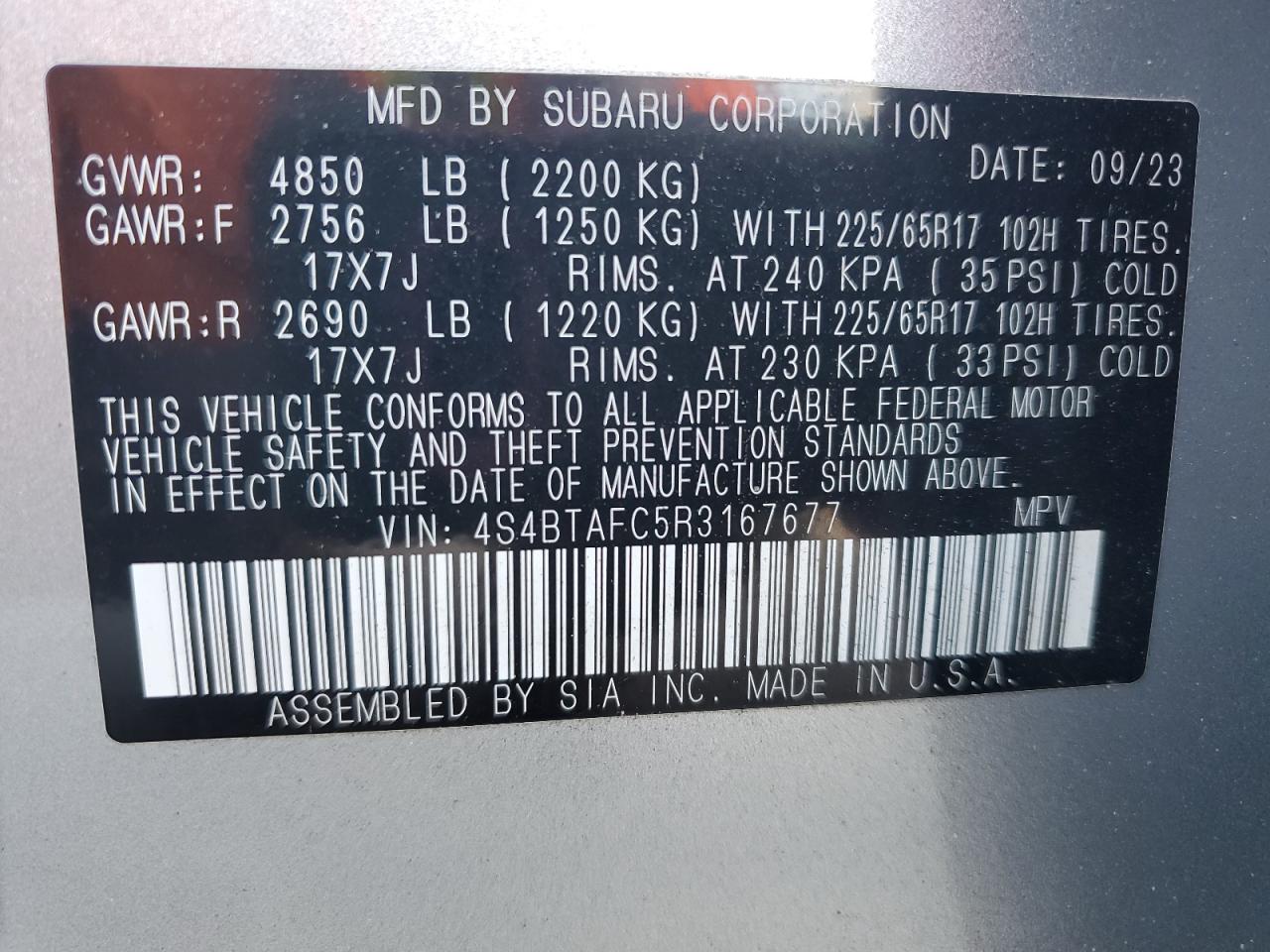 SUBARU OUTBACK 2.5 2024 г.в., Полный привод (4S4BTAFC5R3167677) из США