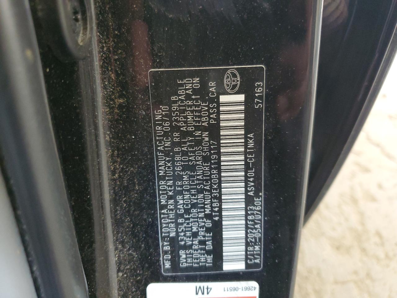 Цвет ЧерныйЦилиндры 4VIN 4T4BF3EK0BR119117Состояние НеизвестноПовреждение Передняя или задняя