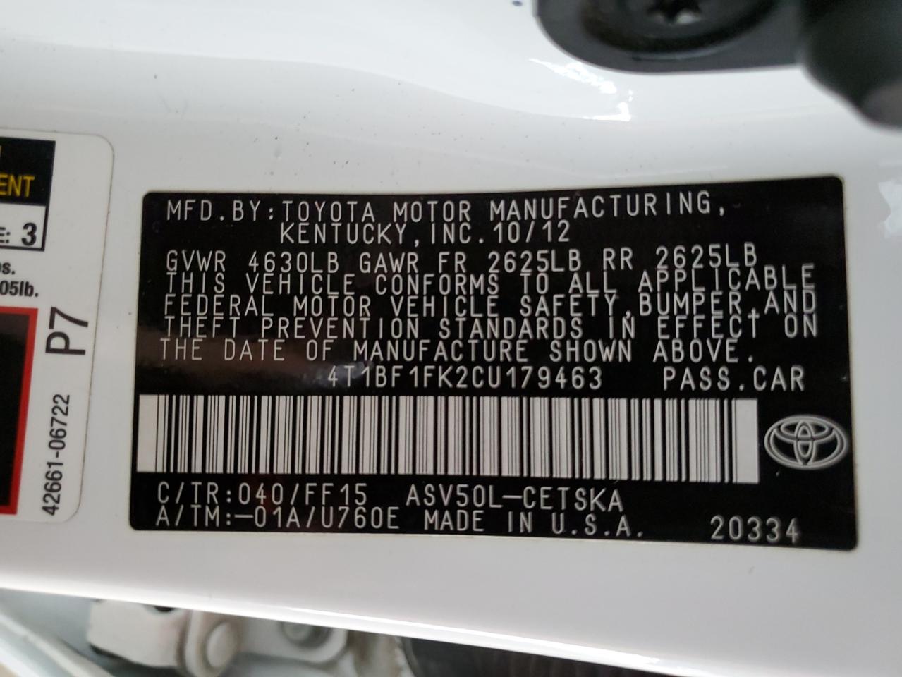 TOYOTA CAMRY 2.5 2012 г.в., (4T1BF1FK2CU179463) из США